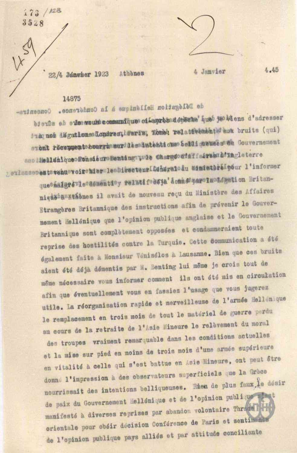| ΤΙΤΛΟΣ | Έκθεση σχετικά με δύο συνεδριάσεις της Συνδιάσκεψης της Λωζάννης για το θέμα των Στενών. |