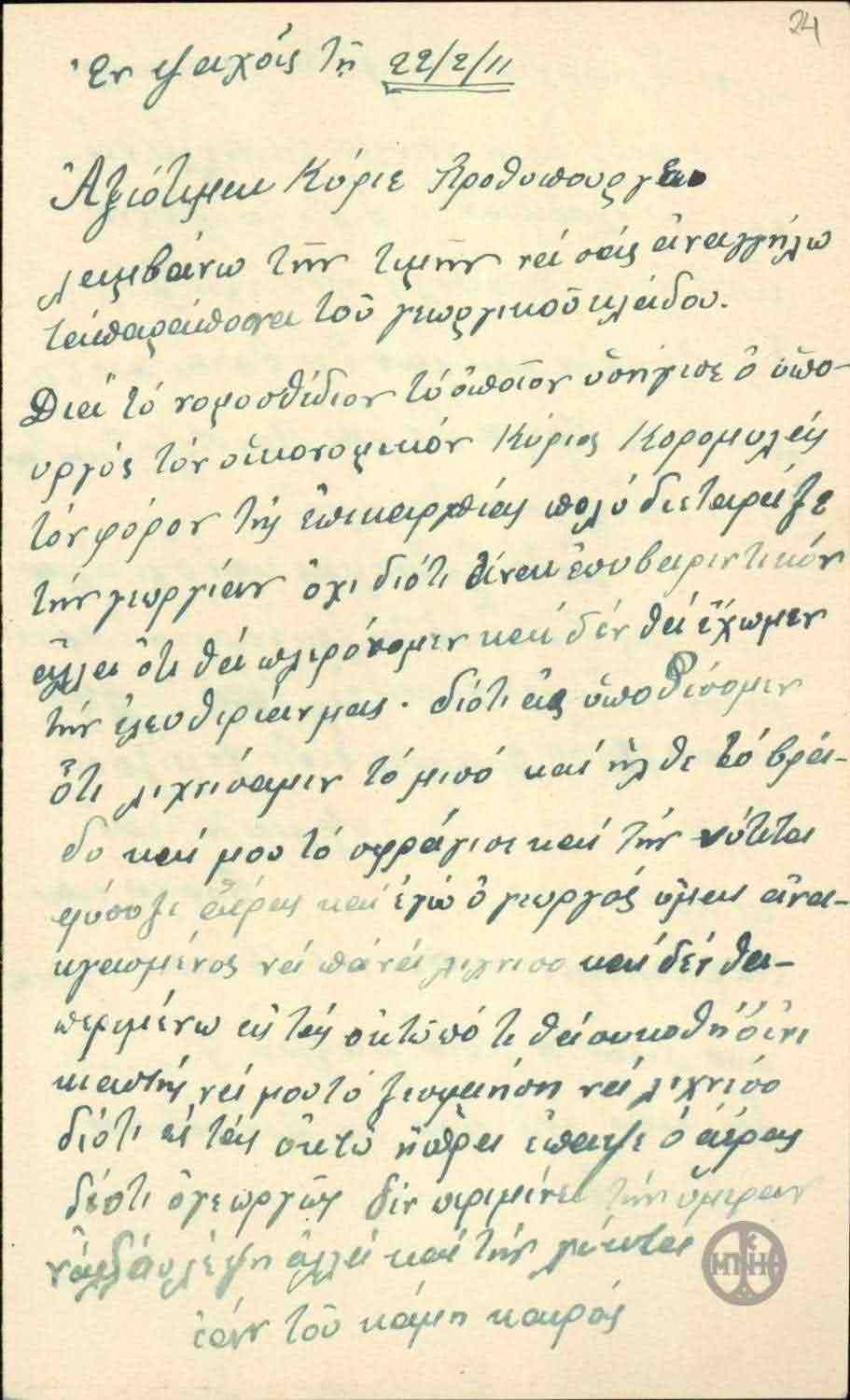 Επιστολή του Γ.Αθ.Ματράκη προς τον Ε.Βενιζέλο σχετικά με το φόρο της επικαρπίας.