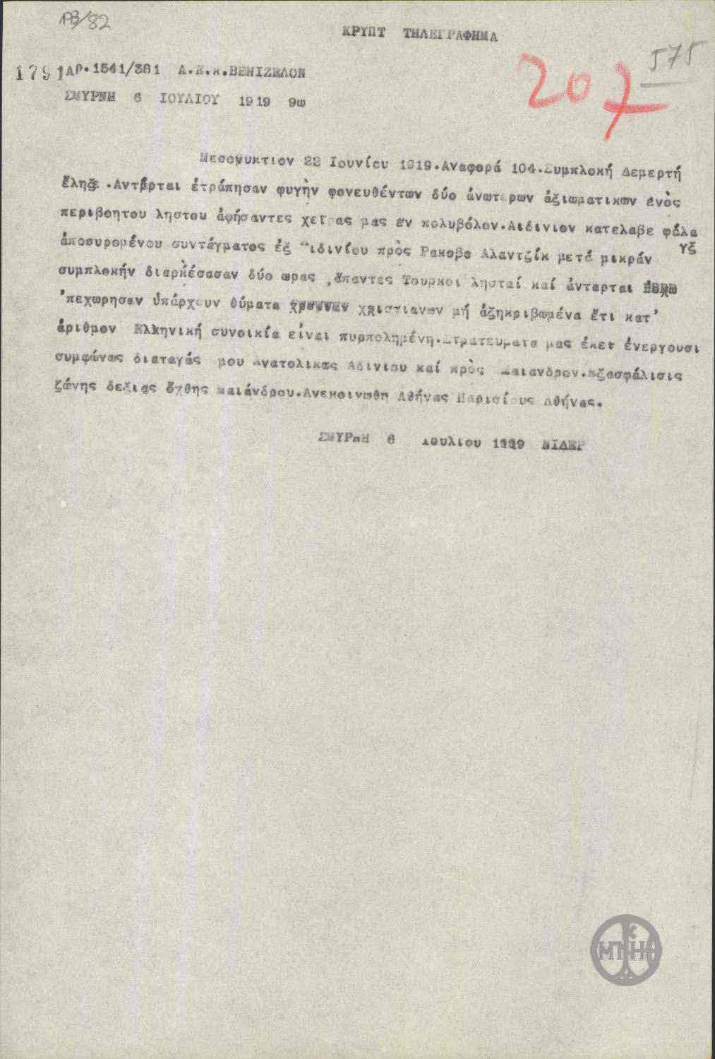 | ΤΙΤΛΟΣ | Τηλεγράφημα του Οθωναίου προς τον Ε.Βενιζέλο σχετικά με την κατάσταση που επικρατεί στην ευρύτερη περιοχή της Σμύρνης. |