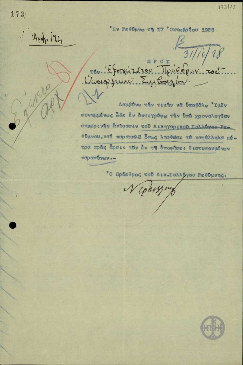 | ΤΙΤΛΟΣ | Διαβιβαστικό του Προέδρου του Δικηγορικού Συλλόγου Ρεθύμνου προς τον Ε.Βενιζέλο με το οποίο του αποστέλλει απόφαση του Δικηγορικού Συλλόγου Ρεθύμνου. |
