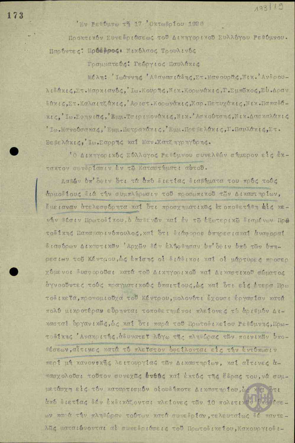 | ΤΙΤΛΟΣ | Πρακτικό Συνεδριάσεως του Δικηγορικού Συλλόγου Ρεθύμνης. |
