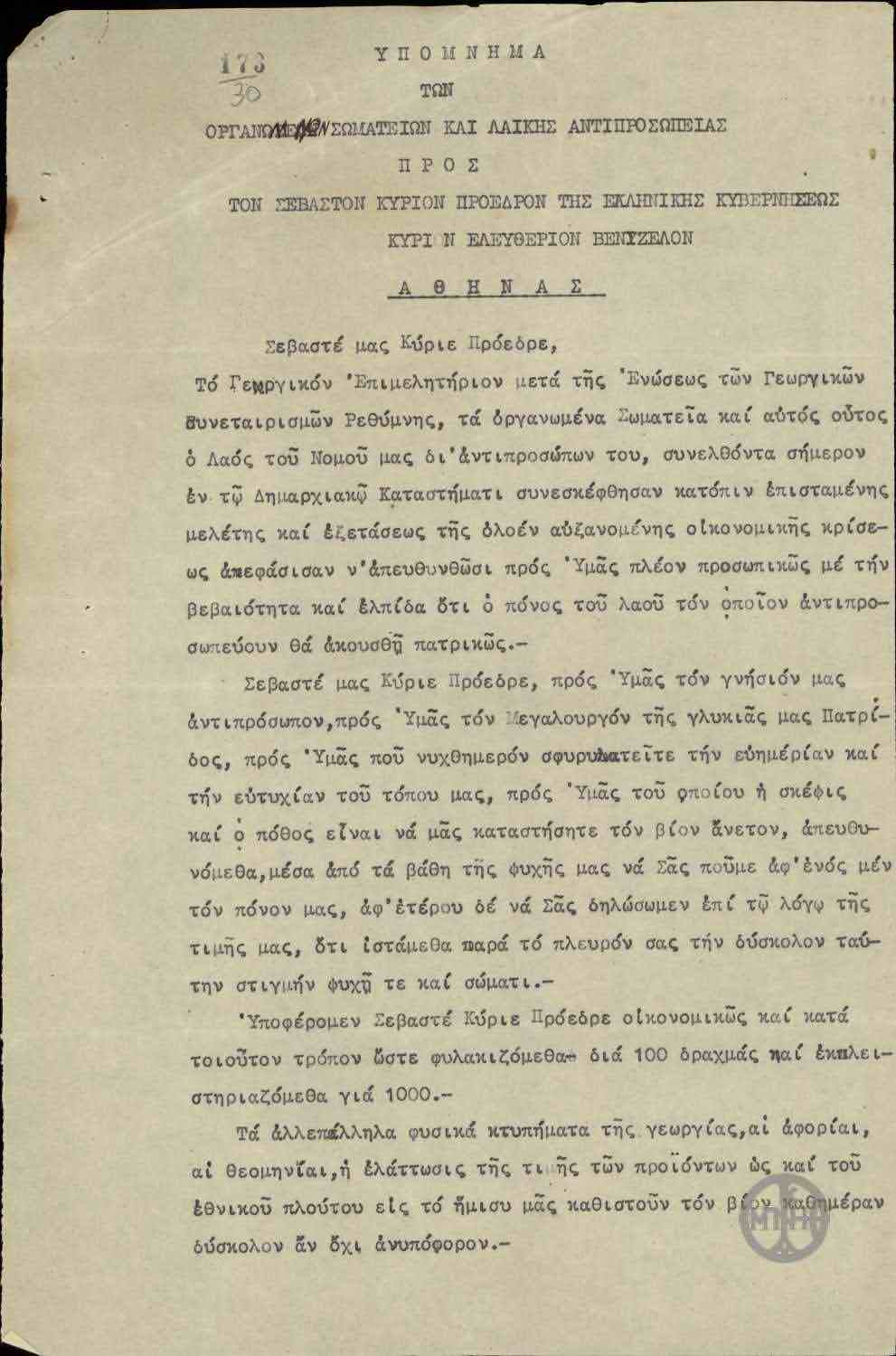 | ΤΙΤΛΟΣ | Υπόμνημα των Οργανωμένων Σωματείων και Λαϊκής Αντιπροσωπείας προς τον Ε.Βενιζέλο σχετικά με αίτηματα για την αντιμετώπιση των οικονομικών τους δυσχερειών. |