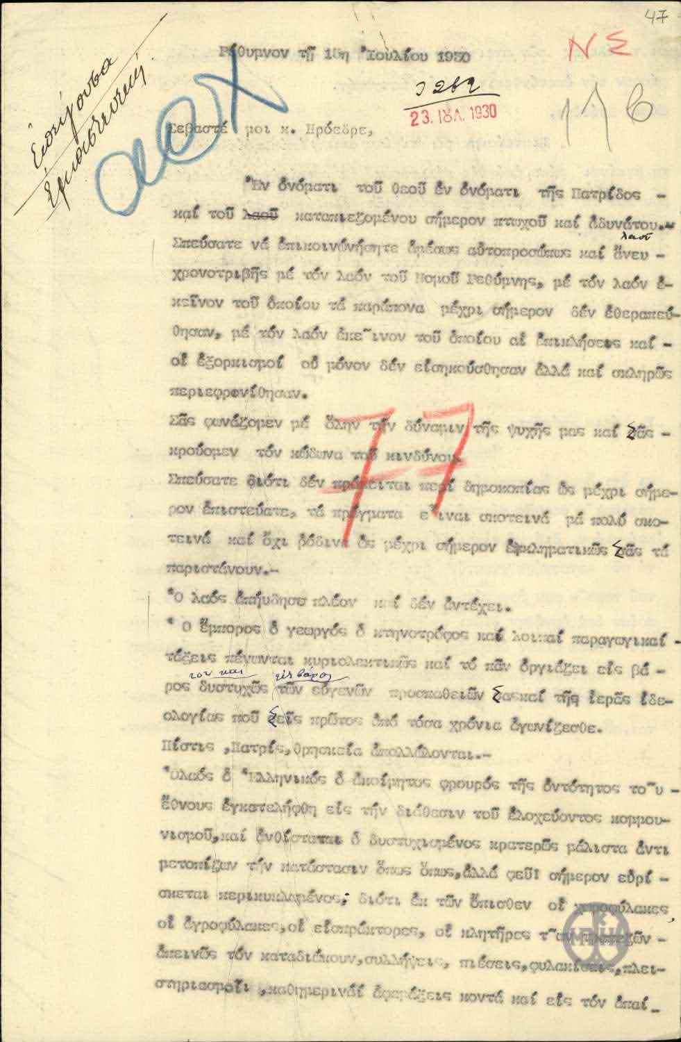 | ΤΙΤΛΟΣ | Επιστολή προς τον Ε.Βενιζέλο σχετικά με την αναβολή των εκλογών του Σεπτεμβρίου. |