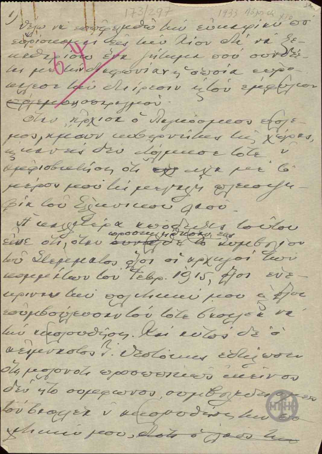 ΤΙΤΛΟΣ | Επιστολή του Κ.Π.Πανούδη προς τον Ε.Βενιζέλο σχετικά με την κατάσταση που επικρατεί στη Χίο. |