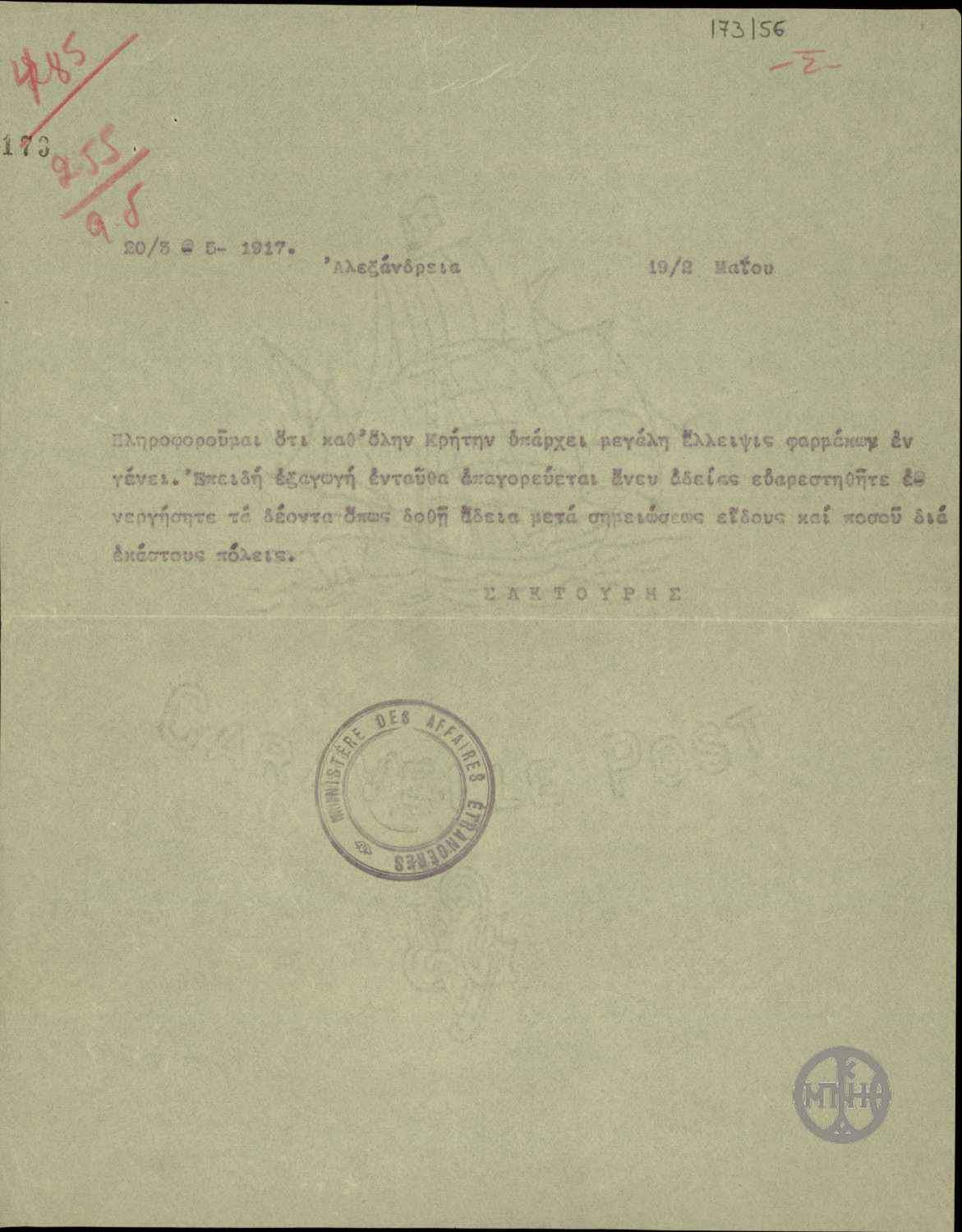 | ΤΙΤΛΟΣ | Τηλεγράφημα του Σαχτούρη σχετικά με την έλλειψη φαρμάκων στην Κρήτη. |