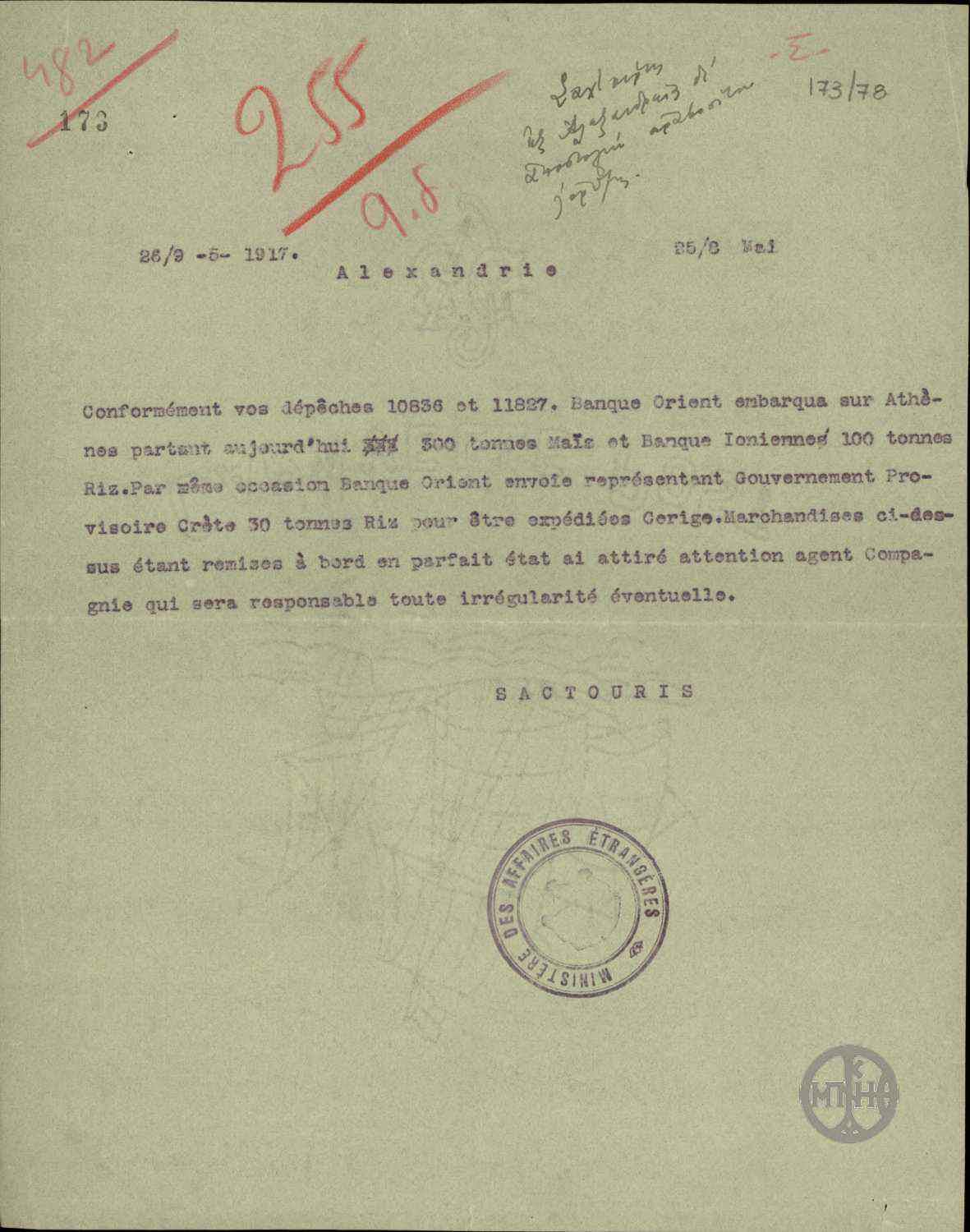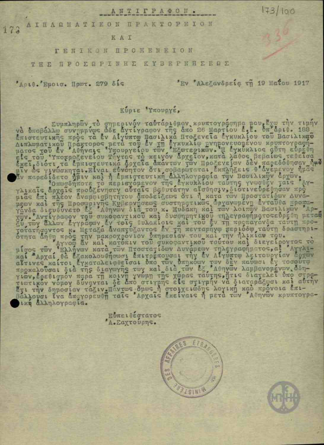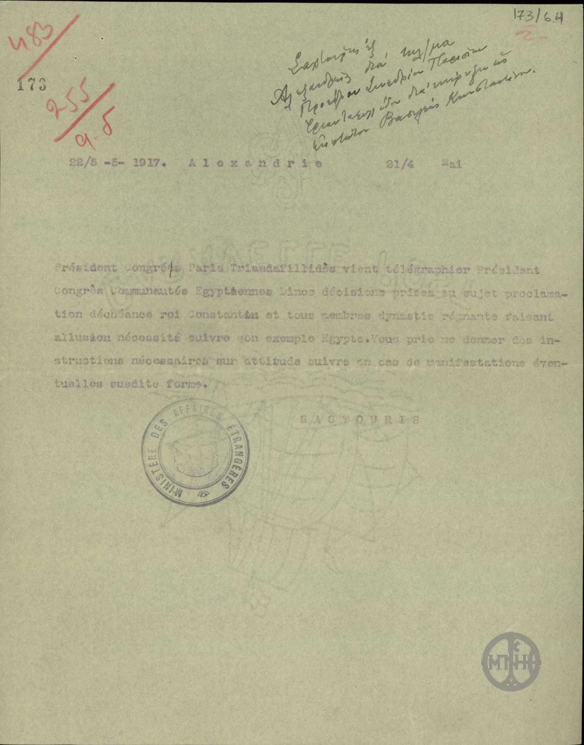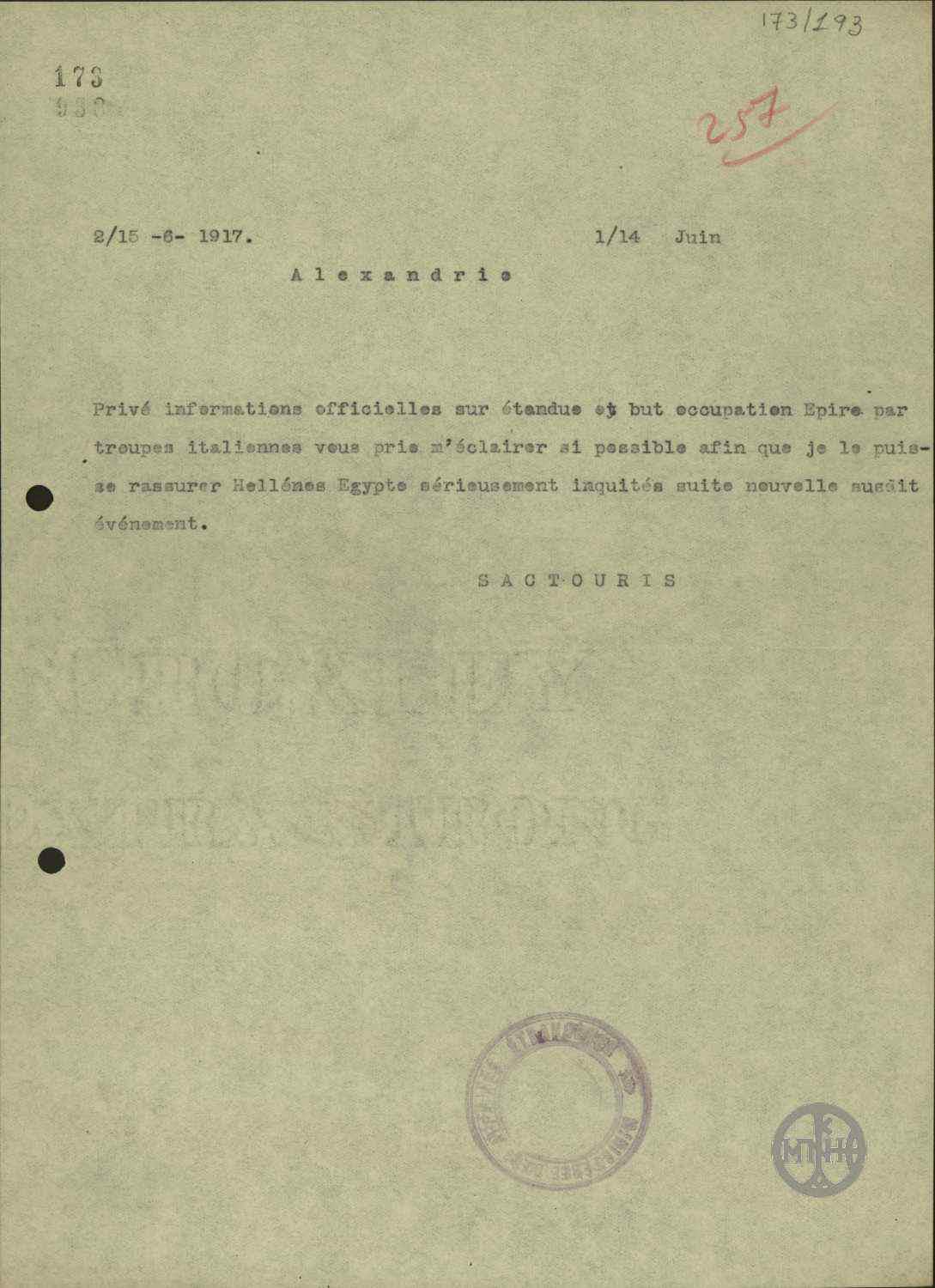 | ΤΙΤΛΟΣ | Τηλεγράφημα του Α.Σακτούρη σχετικά με τηλεγράφημα του Προέδρου του Συνεδρίου των Παρισίων Τριανταφυλλίδη για την κήρυξη ως έκπτωτου του Βασιλιά Κωνσταντίνου. |