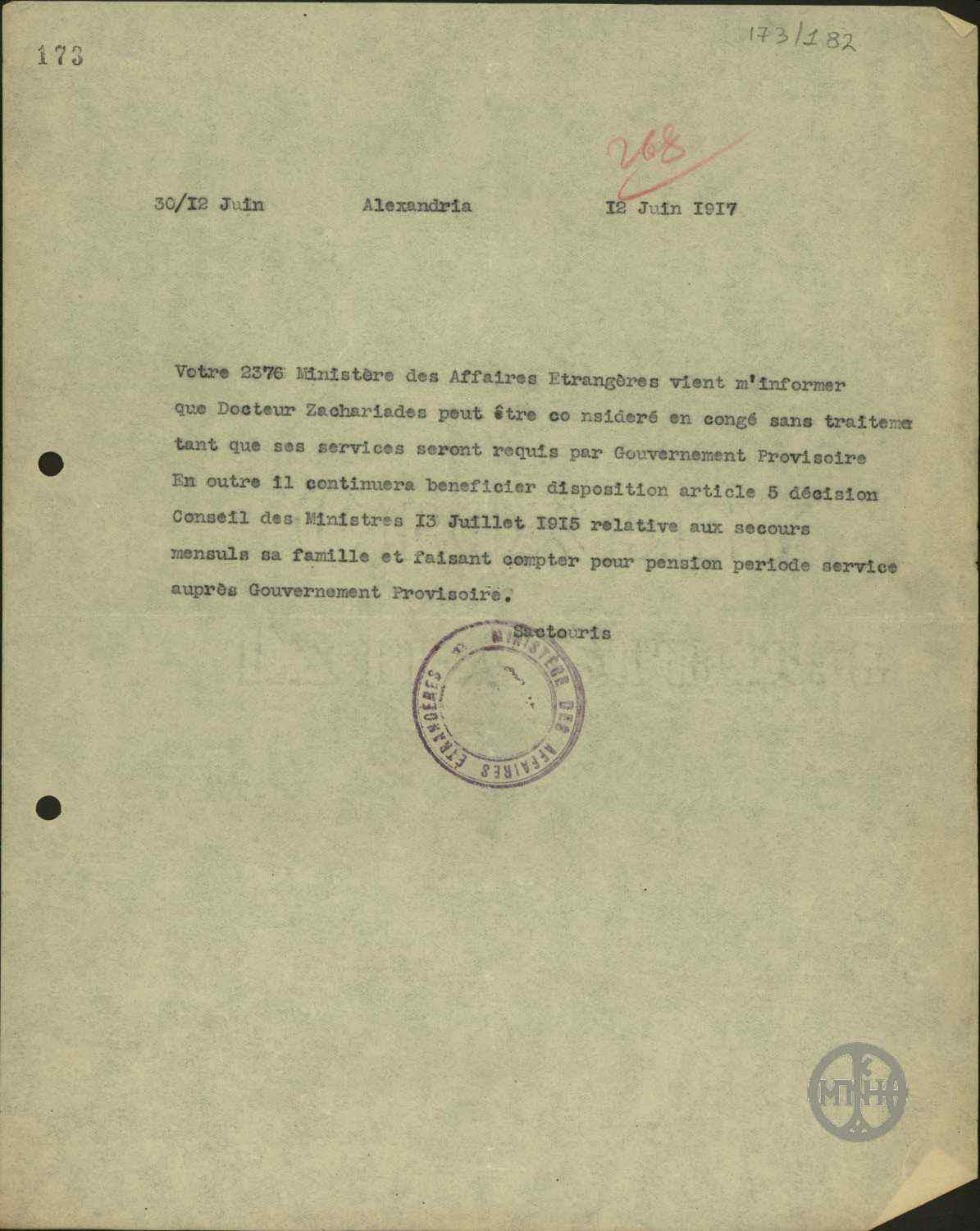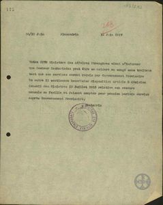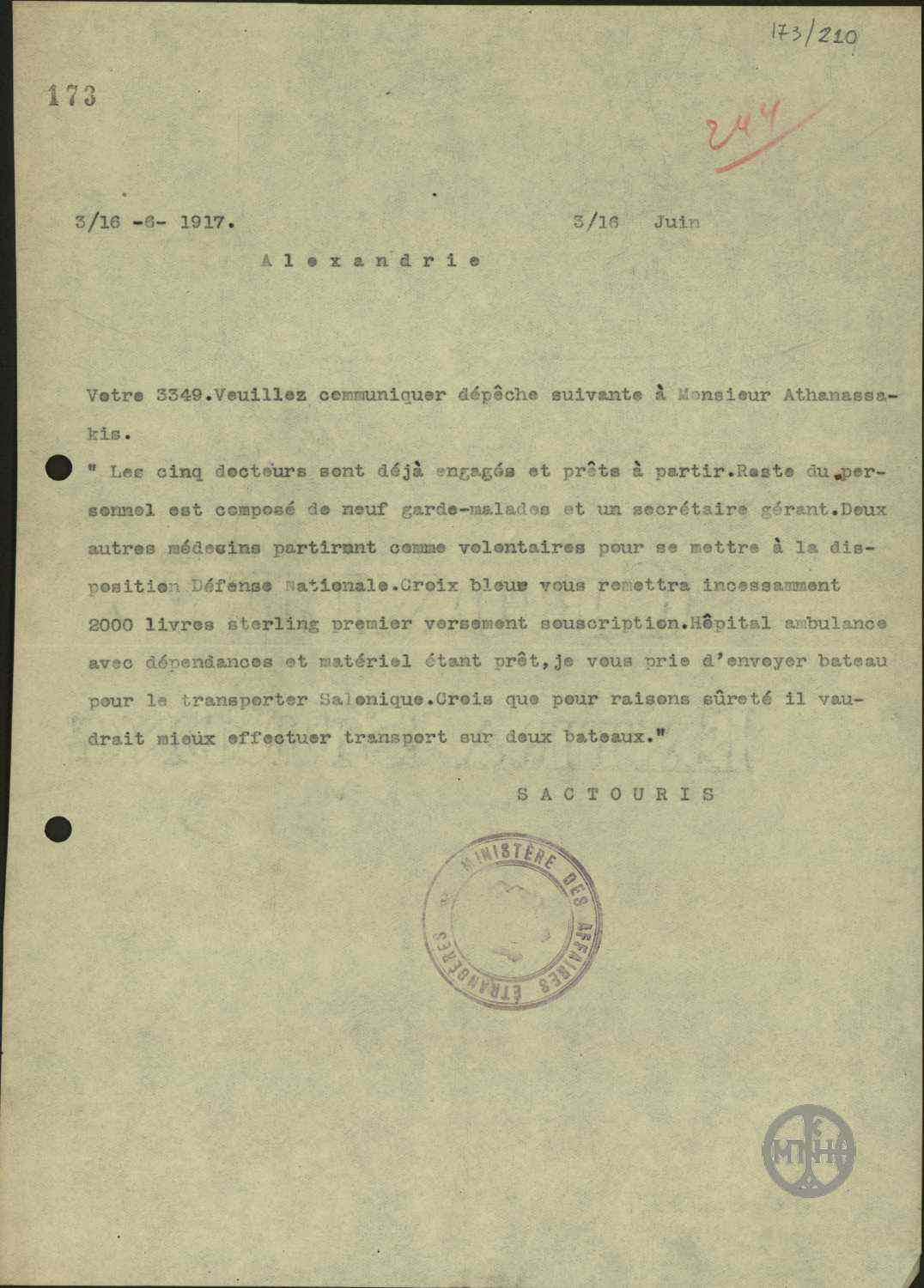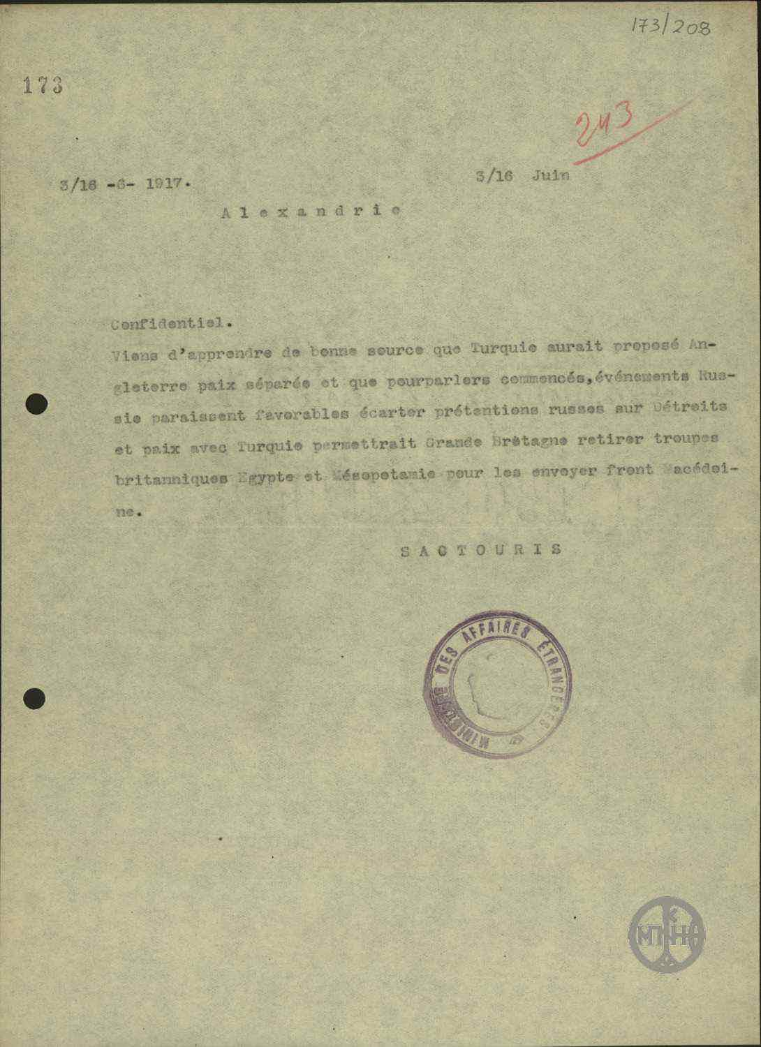 | ΤΙΤΛΟΣ | Τηλεγράφημα του Α.Σακτούρη σχετικά με τηλεγράφημα του Προέδρου του Συνεδρίου των Παρισίων Τριανταφυλλίδη για την κήρυξη ως έκπτωτου του Βασιλιά Κωνσταντίνου. |