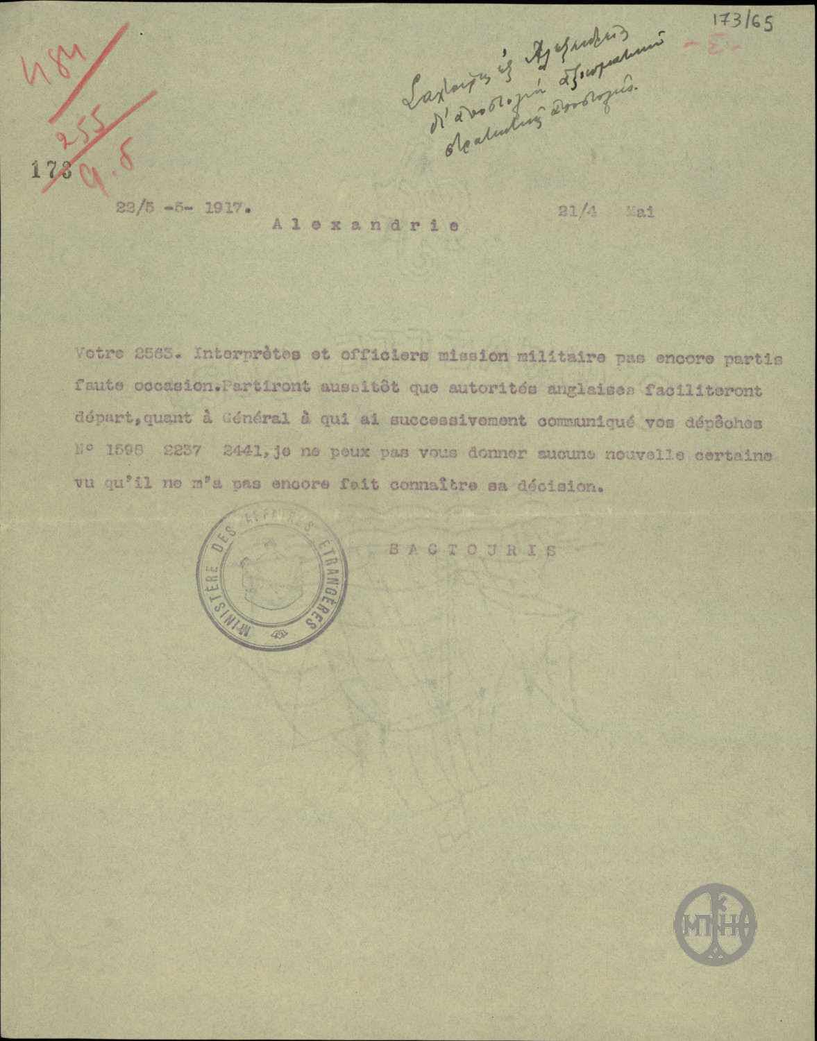 | ΤΙΤΛΟΣ | Τηλεγράφημα του Α.Σακτούρη σχετικά με την αποστολή αξιωματικού στρατιωτικής αποστολής. |