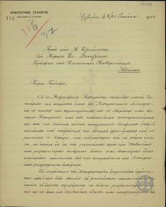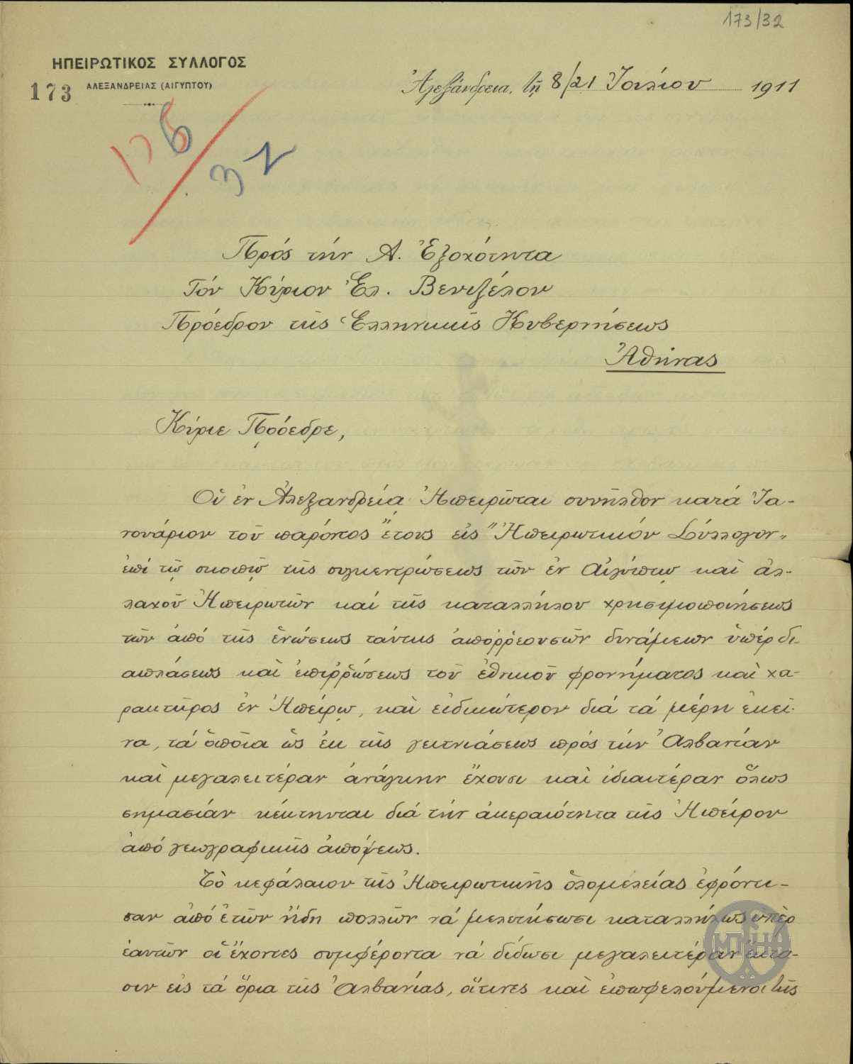 | ΤΙΤΛΟΣ | Επιστολή του Ηπειρωτικού Συλλόγου Αλεξανδρείας (Αιγύπτου) προς τον Ελ. Βενιζέλο ζητώντας του συμβουλές "περί του τρόπου, καθ' ον θα ηδύνατο να φανή περισσότερον ωφέλιμος" για τους δοκιμαζόμενους "εν Ηπείρω" αδελφούς. |