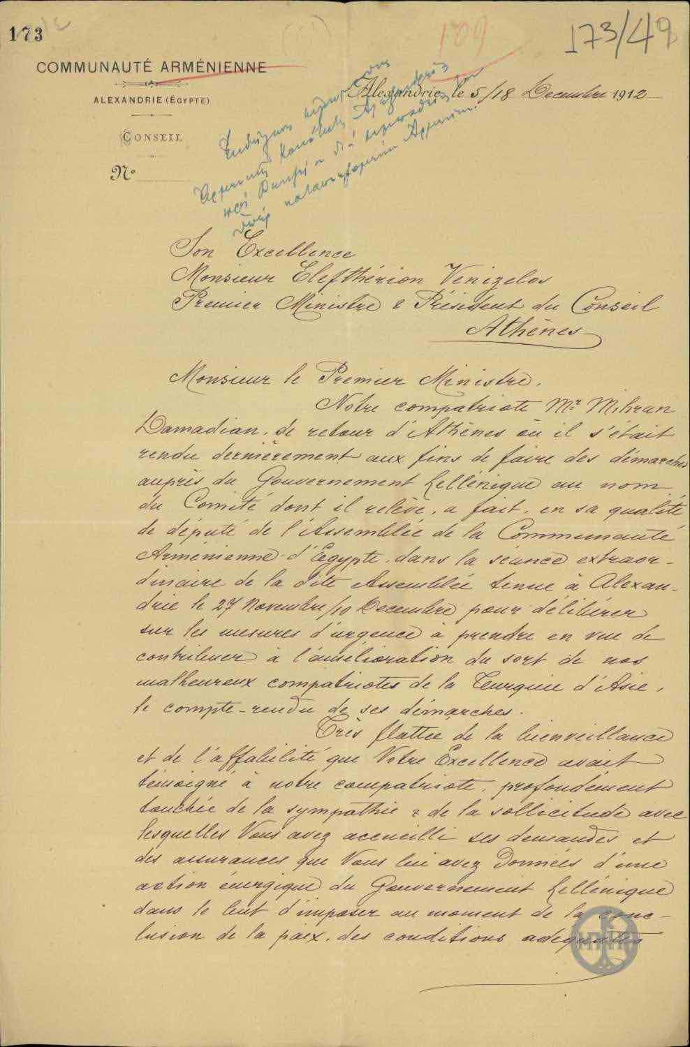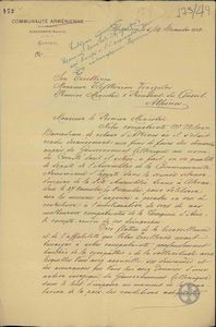 | ΤΙΤΛΟΣ | Επιστολή της Communaute Armenienne της Αλεξάνδρειας (Αιγύπτου) προς τον Ελ. Βενιζέλο εκφράζοντας την ευγνωμοσύνη της για τη συμπάθεια που έδειξε υπέρ των καταπιεζομένων Αρμενίων. |