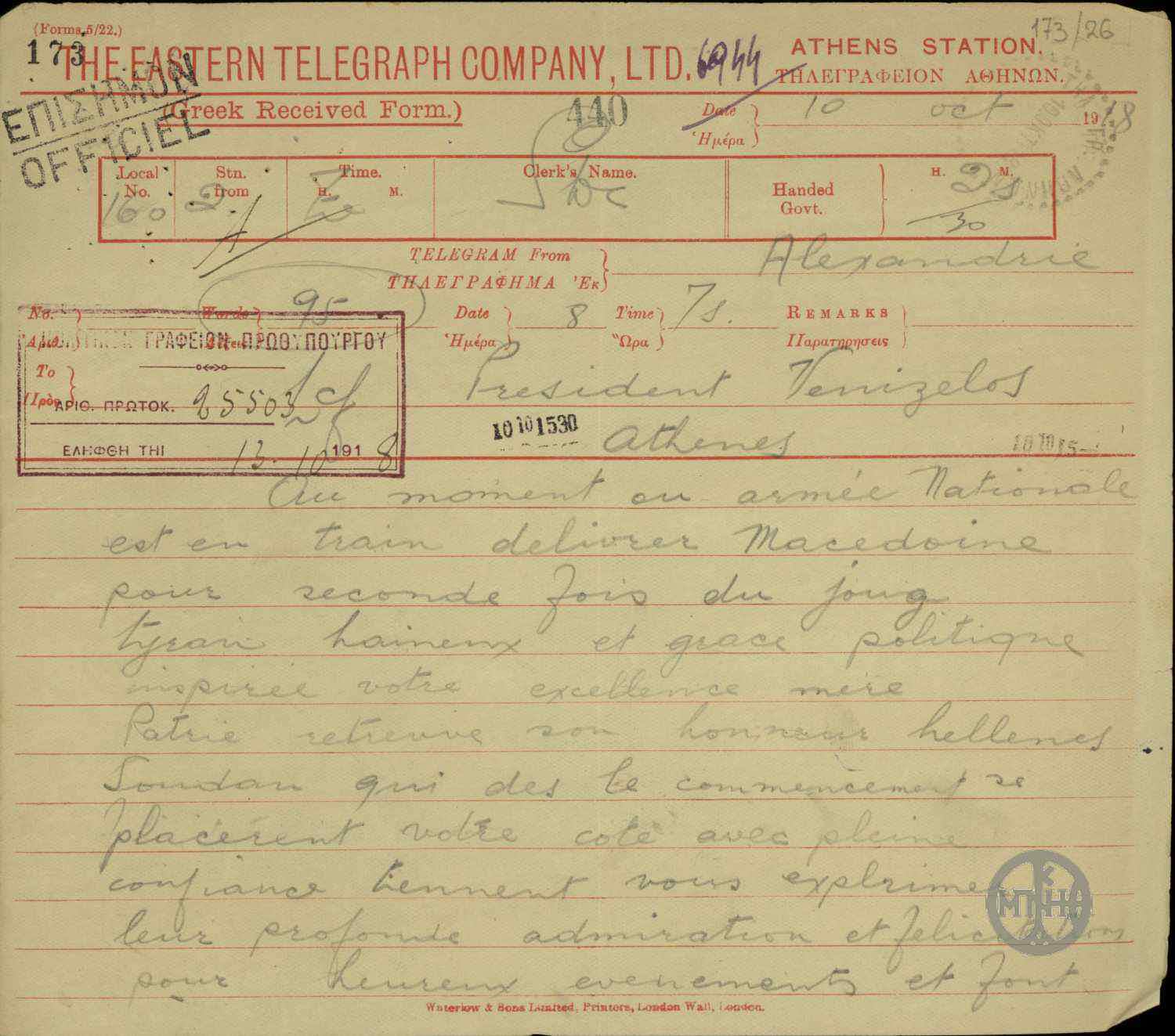 | ΤΙΤΛΟΣ | Διαβιβαστικό του Πανηπειρωτικού Συλλόγου Αλεξανδρείας προς τον Ελ. Βενιζέλο αντίγραφου τηλεγραφήματος της 11/24 Ιανουαρίου 1913. |