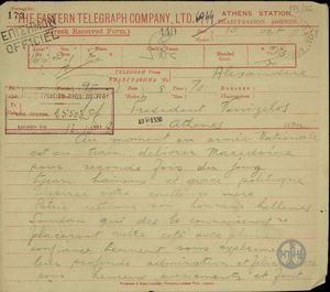 | ΤΙΤΛΟΣ | Τηλεγράφημα του Προέδρου της Ελληνικής Κοινότητας του Chartoum προς τον Ε.Βενιζέλο σχετικά με την αποστολή δωρεάς. |