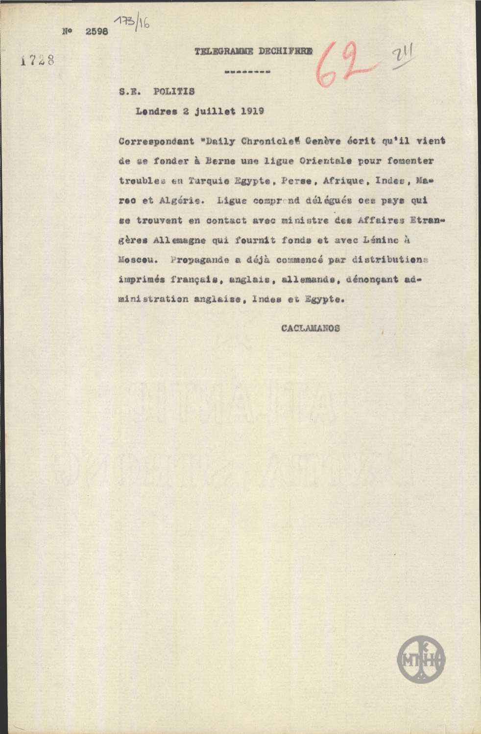 | ΤΙΤΛΟΣ | Τηλεγράφημα του Δ.Κακλαμάνου προς τον Ν.Πολίτη σχετικά με τη δημιουργία Ανατολικού Οργανισμού. |