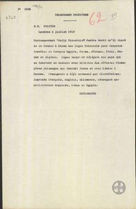 | ΤΙΤΛΟΣ | Τηλεγράφημα του Σ.Σκουλούδη προς το Υπουργείο Εξωτερικών για τα δημοσιεύματα του αγγλικού τύπου σχετικά με τις προστριβές ανάμεσα στους Συμμάχους. |