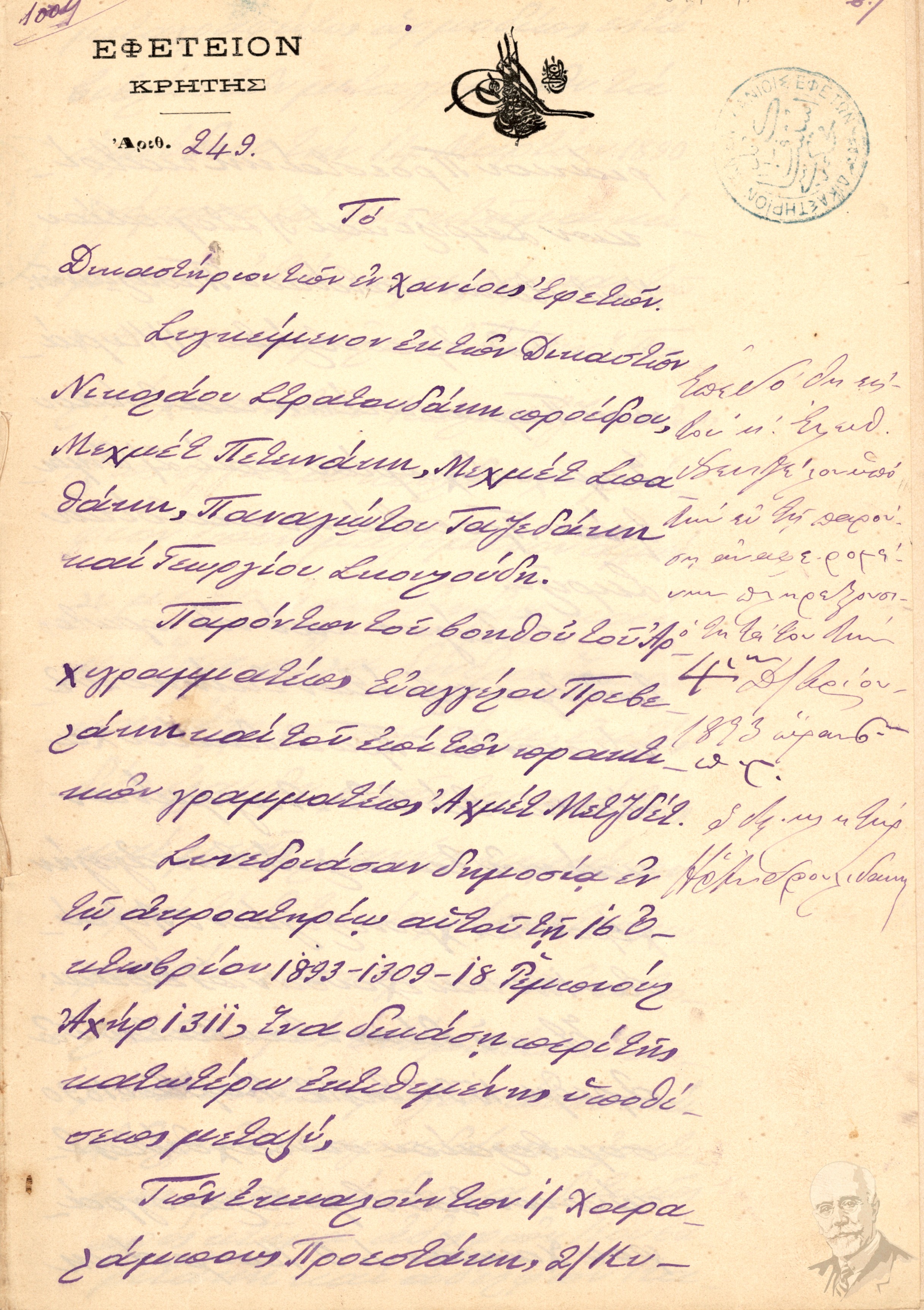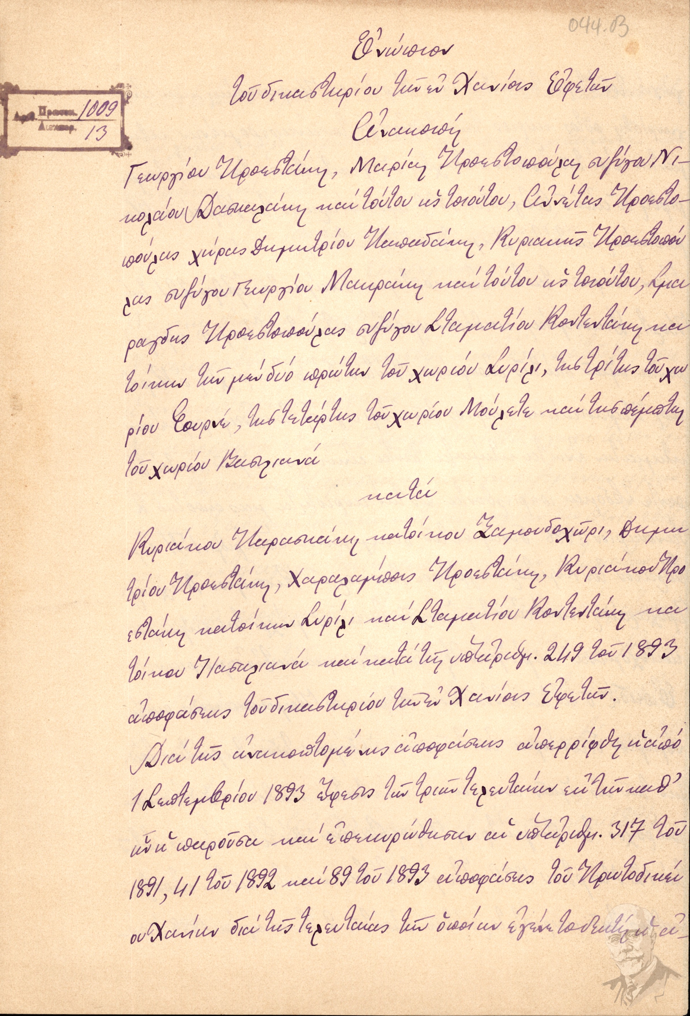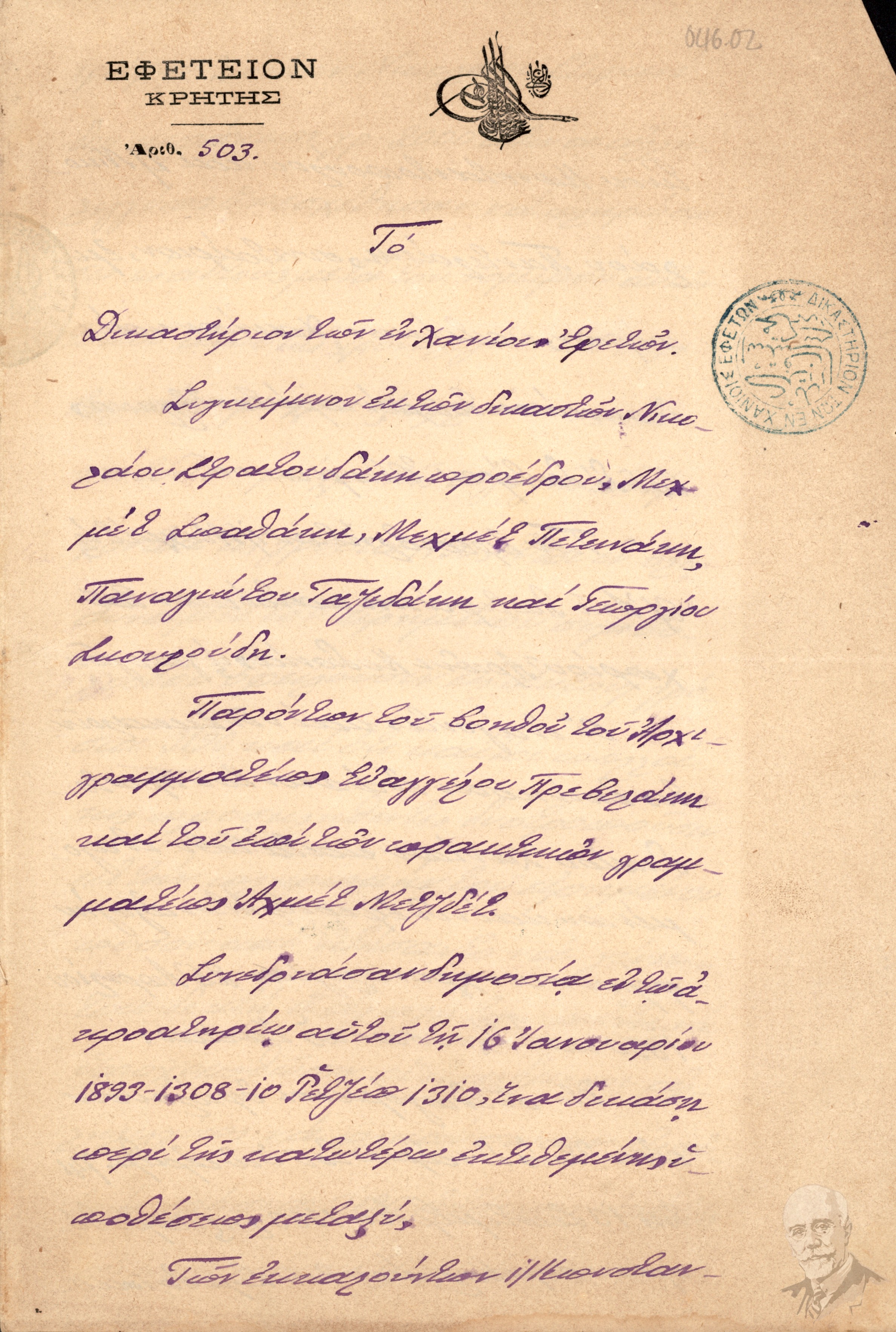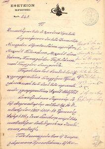 | Τίτλος (Υπόθεση) | Επιδοτήριο με αριθμό 5227/1892 με το οποίο ο δικαστικός κλητήρας Δημήτριος Σταματάκης επέδωσε στον Πλουμιδάκη Χαράλαμπο, δικήγόρο και πληρεξούσιο του Χατζουλάκη Χουσεΐν Τσαούς την υπ. Αριθμ. 1729/317 18ης Μαίου 1892 γνωστοποίηση και κλήση κατά του Χουσεΐν Τσαούς Χατζουλάκη και τον καλεί να παραστεί στην ακρόαση των μαρτύρων κατά της διεξαγωγή των επιβληθεισών από το Δικαστήριο σε αυτήν αποδείξεων στις 3 Ιουνίου 1892. |