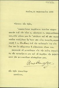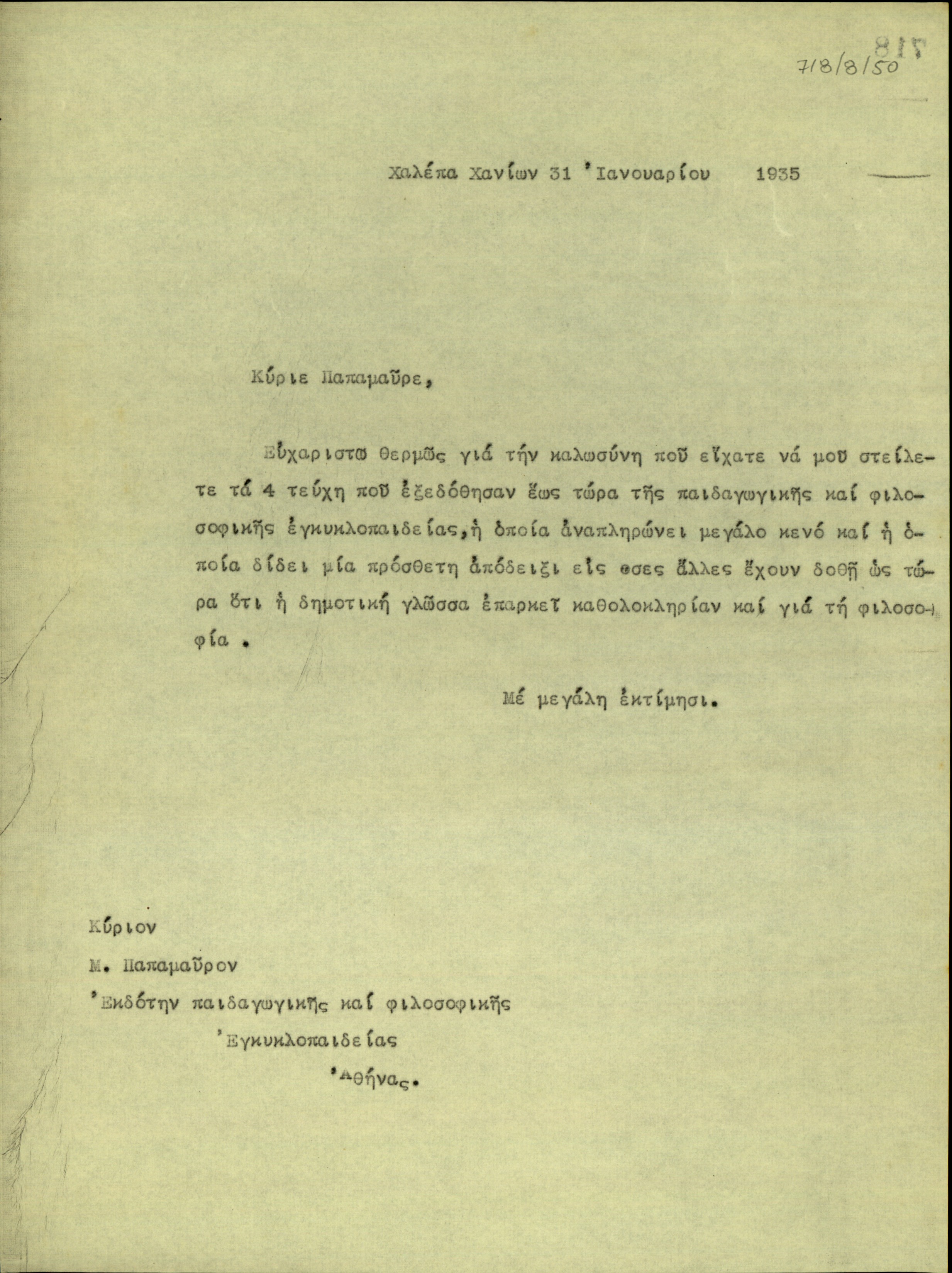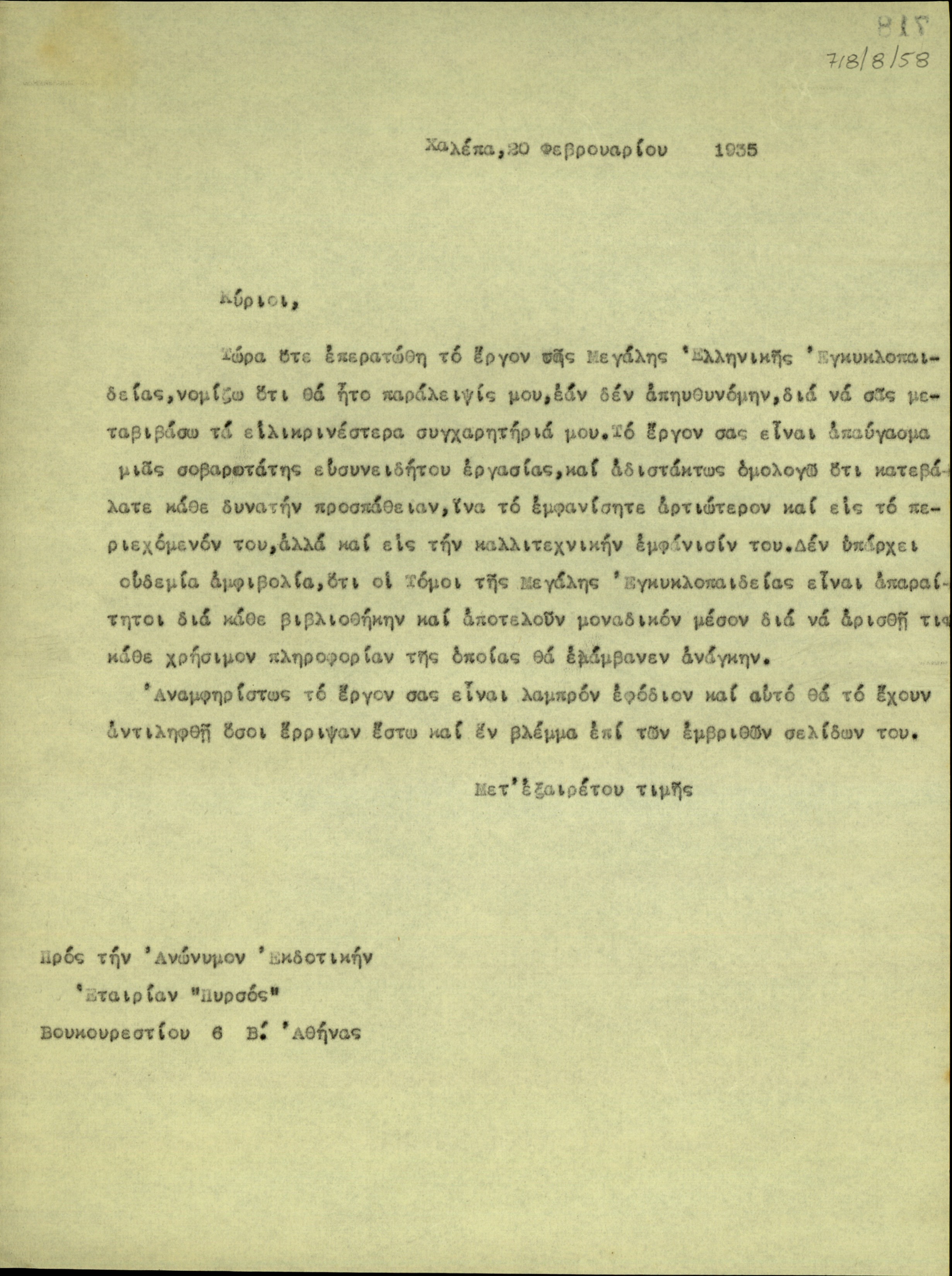 | ΤΙΤΛΟΣ | Επιστολή του Ε. Βενιζέλου προς την Ανώνυμη Εταιρεία "Πυρσός" με την οποία εκφράζει τα συγχαρητήριά του για την ολοκλήρωση της έκδοσης της Μεγάλης Ελληνικής Εγκυκλοπαίδειας. |