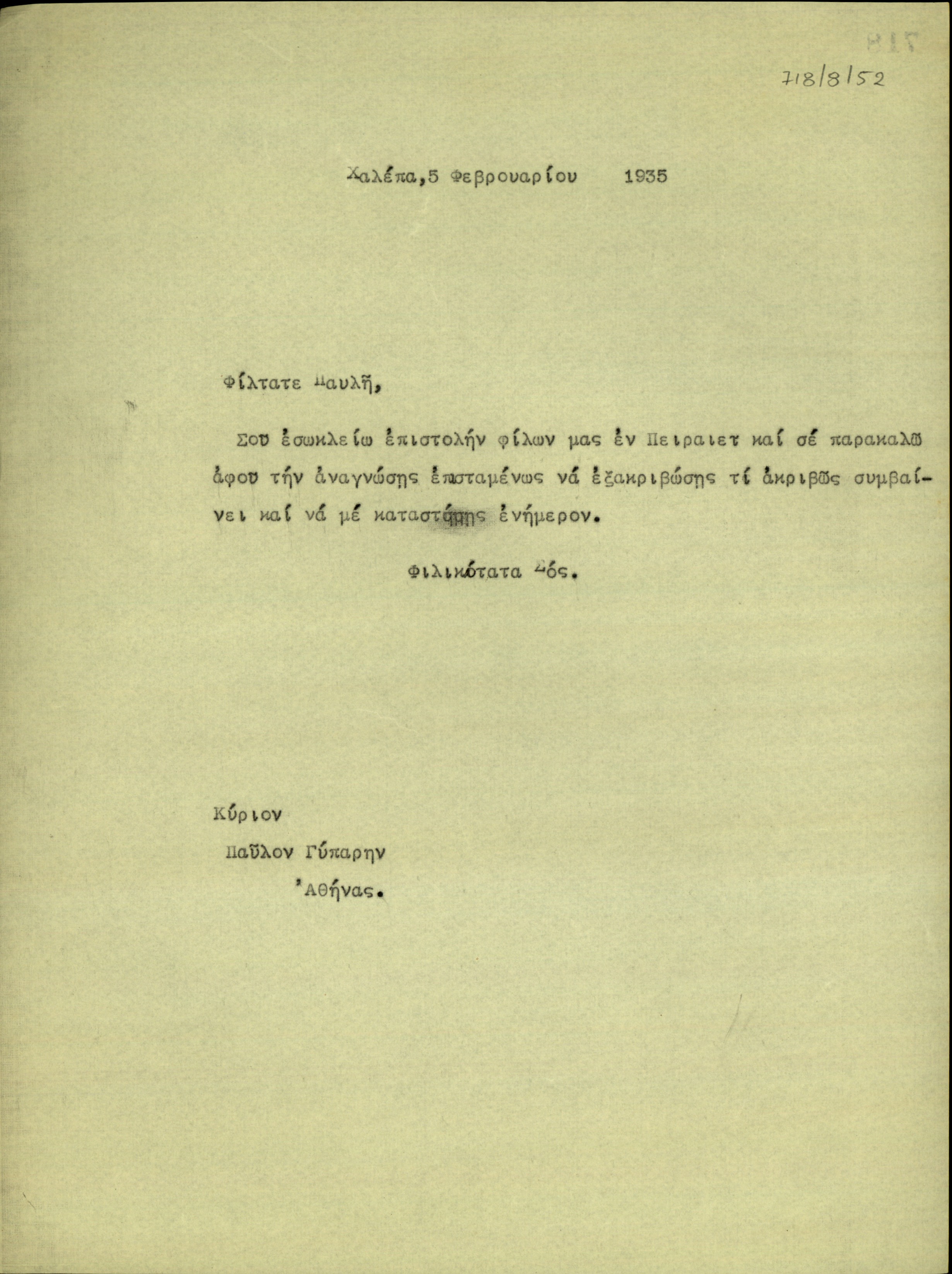 | ΤΙΤΛΟΣ | Επιστολή του Ε. Βενιζέλου προς τον Π. Γυπάρη με την οποία διαβιβάζει επιστολή φίλων από τον Πειραιά και του ζητεί να μεριμνήσει για το θέμα. |