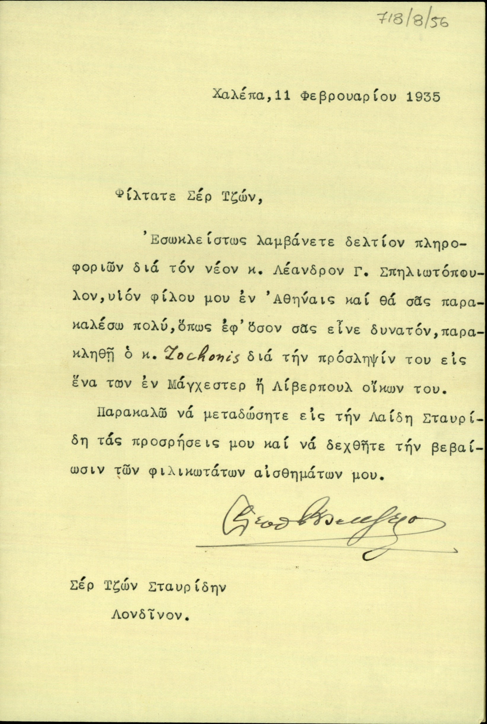 | ΤΙΤΛΟΣ | Επιστολή του Ε. Βενιζέλου προς τον Ι. Σταυρίδη σχετικά με την πρόσληψη του Λέαν. Γ. Σπηλιωτόπουλου. |