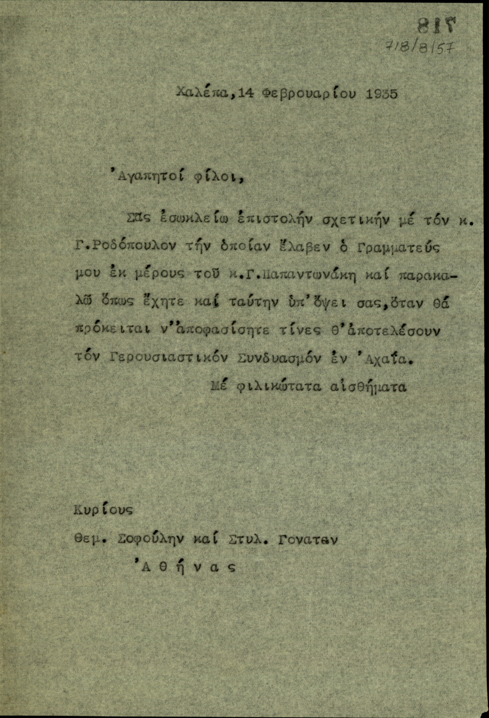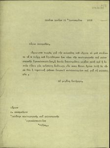| ΤΙΤΛΟΣ | Επιστολή του Ε. Βενιζέλου προς τους Θ. Σοφούλη και Στ. Γονατά σχετικά με την κατάρτιση του γερουσιαστικού συνδυασμού για το νομό Αχαΐας. |