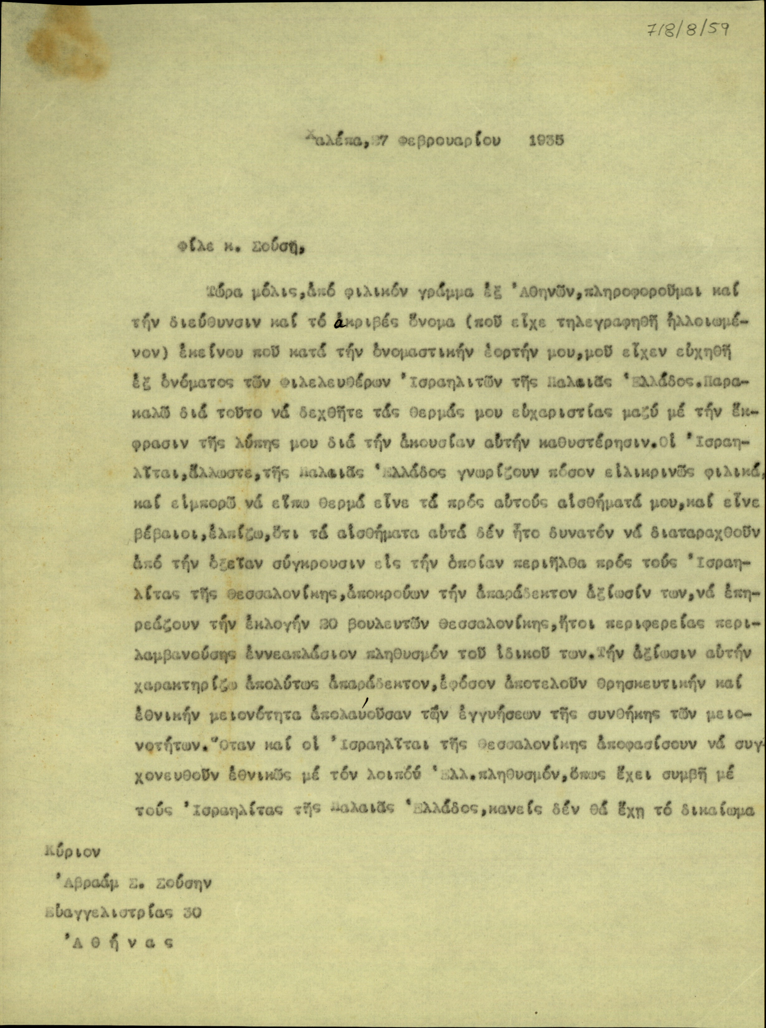 | ΤΙΤΛΟΣ | Επιστολή του Ε. Βενιζέλου προς τον Αβραάμ Σούση σχετικά με τα αισθήματά του απέναντι στους Ισραηλίτες και την αξίωση των Ισραηλιτών Θεσαλονίκης να αποτελούν ξεχωριστό εκλογικό κατάλογο. |
