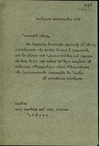 | ΤΙΤΛΟΣ | Επιστολή του Ε. Βενιζέλου προς τον Μπακιρτζή σχετικά με τη χορήγηση χρημάτων στο Λύκειο Ελληνίδων Ρεθύμνου. |