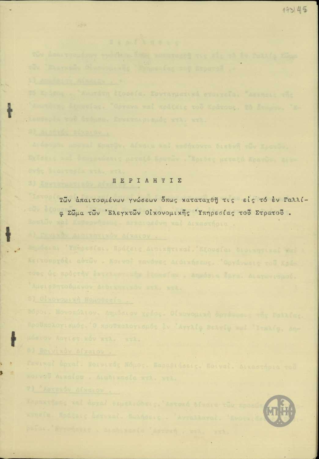 | ΤΙΤΛΟΣ | "Περίληψις των απαιτουμένων γνώσεων όπως καταταχθή τις εις το εν Γαλλία Σώμα των Ελεγκτών Οικονομικής Υπηρεσίας του Στρατού". |