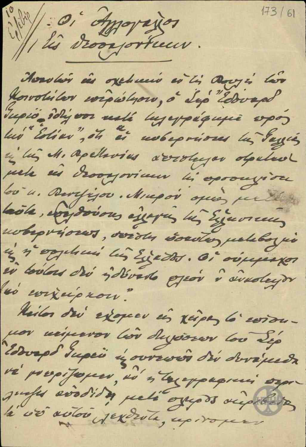 | ΤΙΤΛΟΣ | Σημείωσεις του Ε.Βενιζέλου για την εφημερίδα Κήρυξ. |