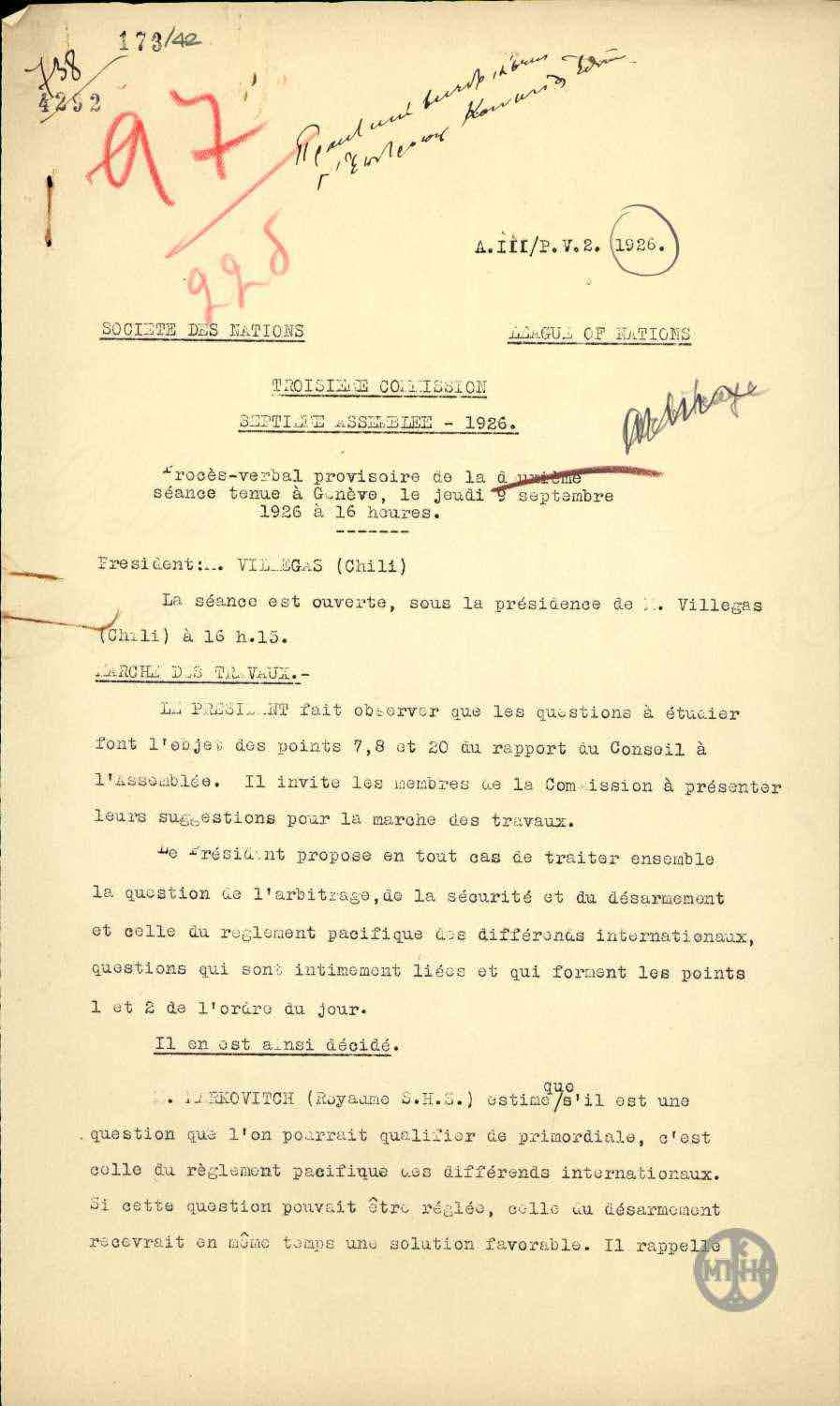 | ΤΙΤΛΟΣ | Πρακτικό συνεδρίασης της Κοινωνίας των Εθνών σχετικά με τη δυνατότητα δανειοδότησης της Ελληνικής Κυβέρνησης για την αποκατάσταση των προσφύγων. |