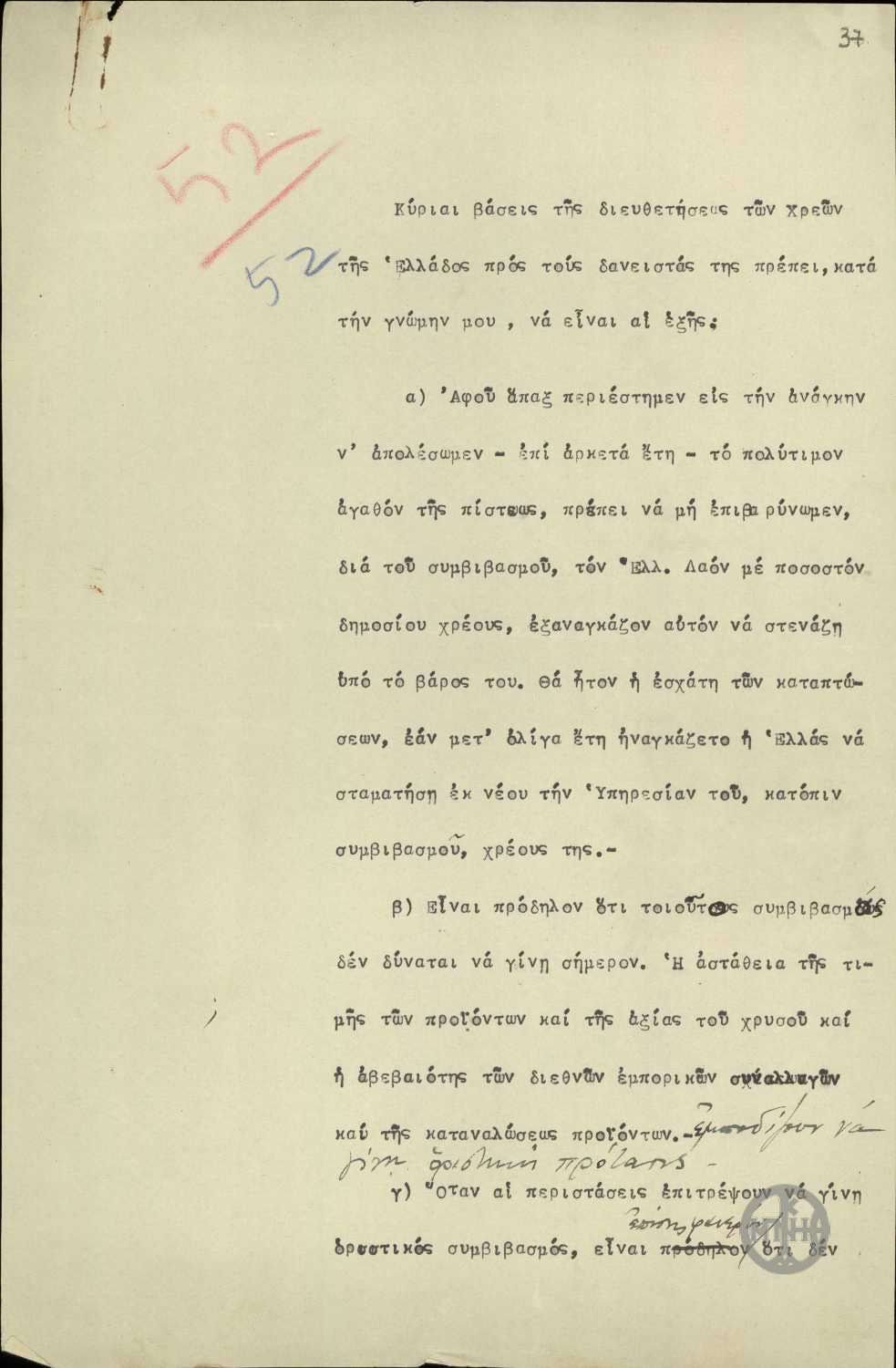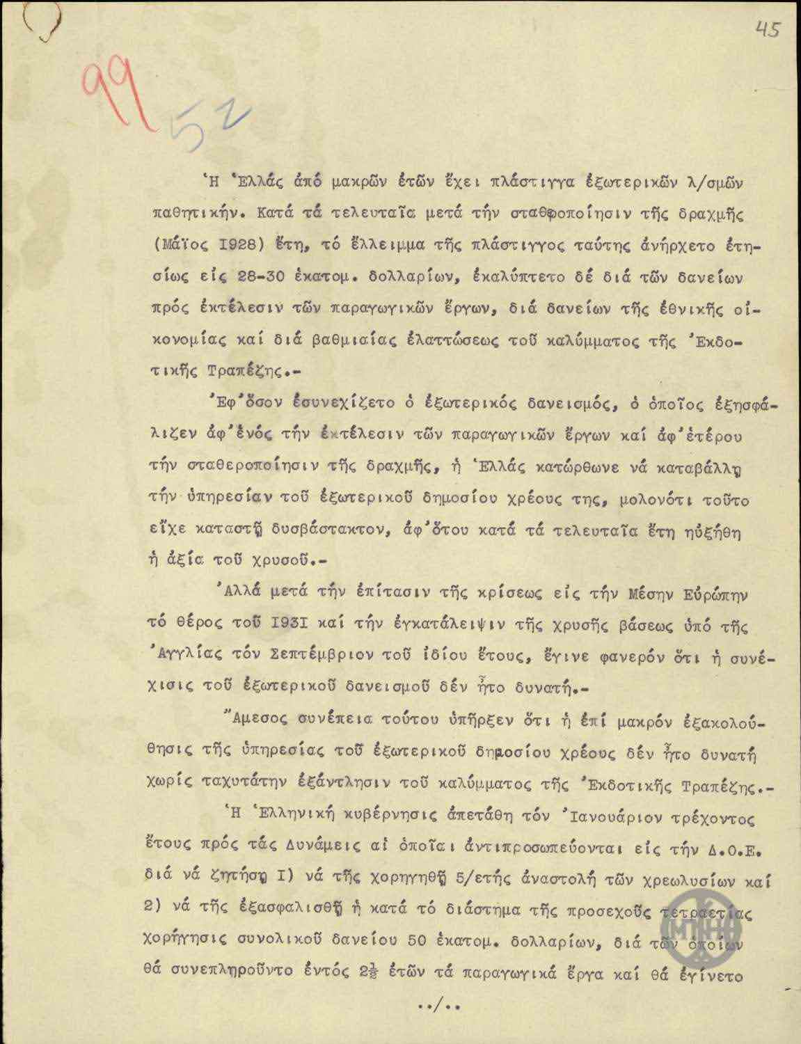 | ΤΙΤΛΟΣ | Υπόμνημα περί του προβλήματος των εις ξένον νόμισμα εθνικών δανείων και περί του δυνατού της μερικής εξυπηρετήσεως αυτών. |