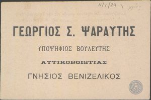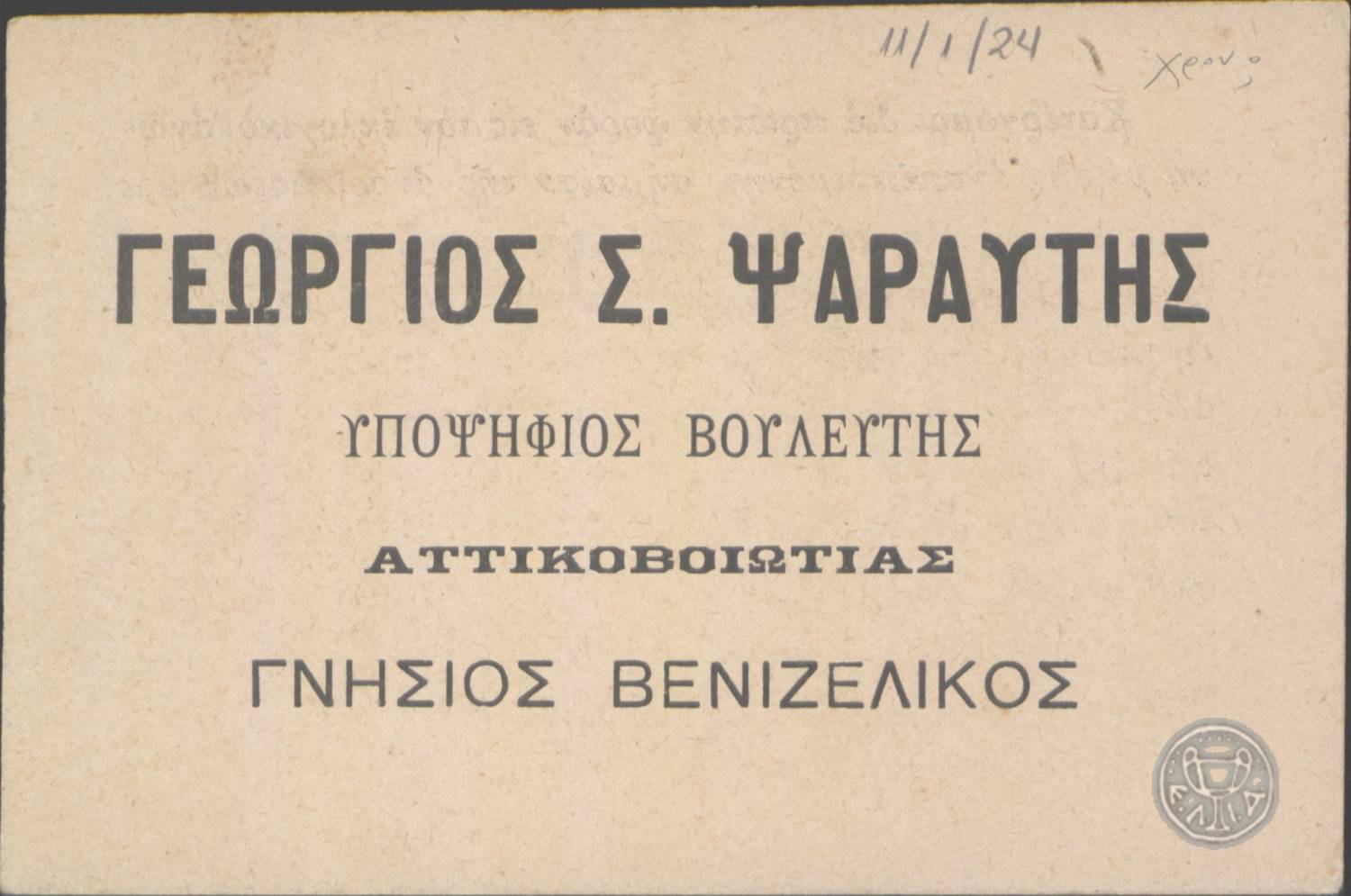| Κύριος Τίτλος | Προεκλογική κάρτα του βενιζελικού υποψηφίου βουλευτή Αττικοβοιωτίας Γεωργίου Σ. Ψαραύτη. |