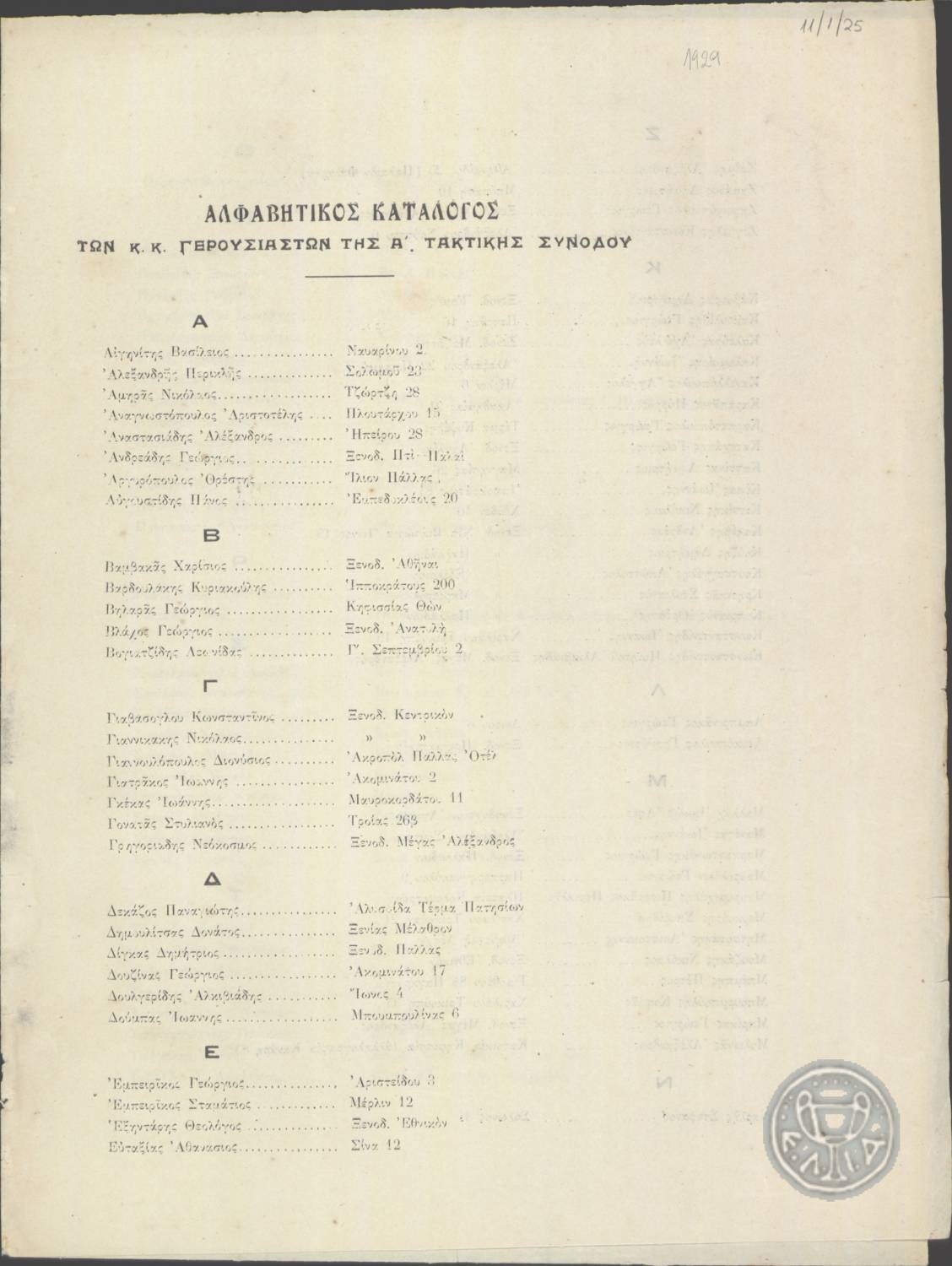 | Κύριος Τίτλος | Αλφαβητικός κατάλογος των κ.κ.Γερουσιαστών της Α' Τακτικής Συνόδου. |