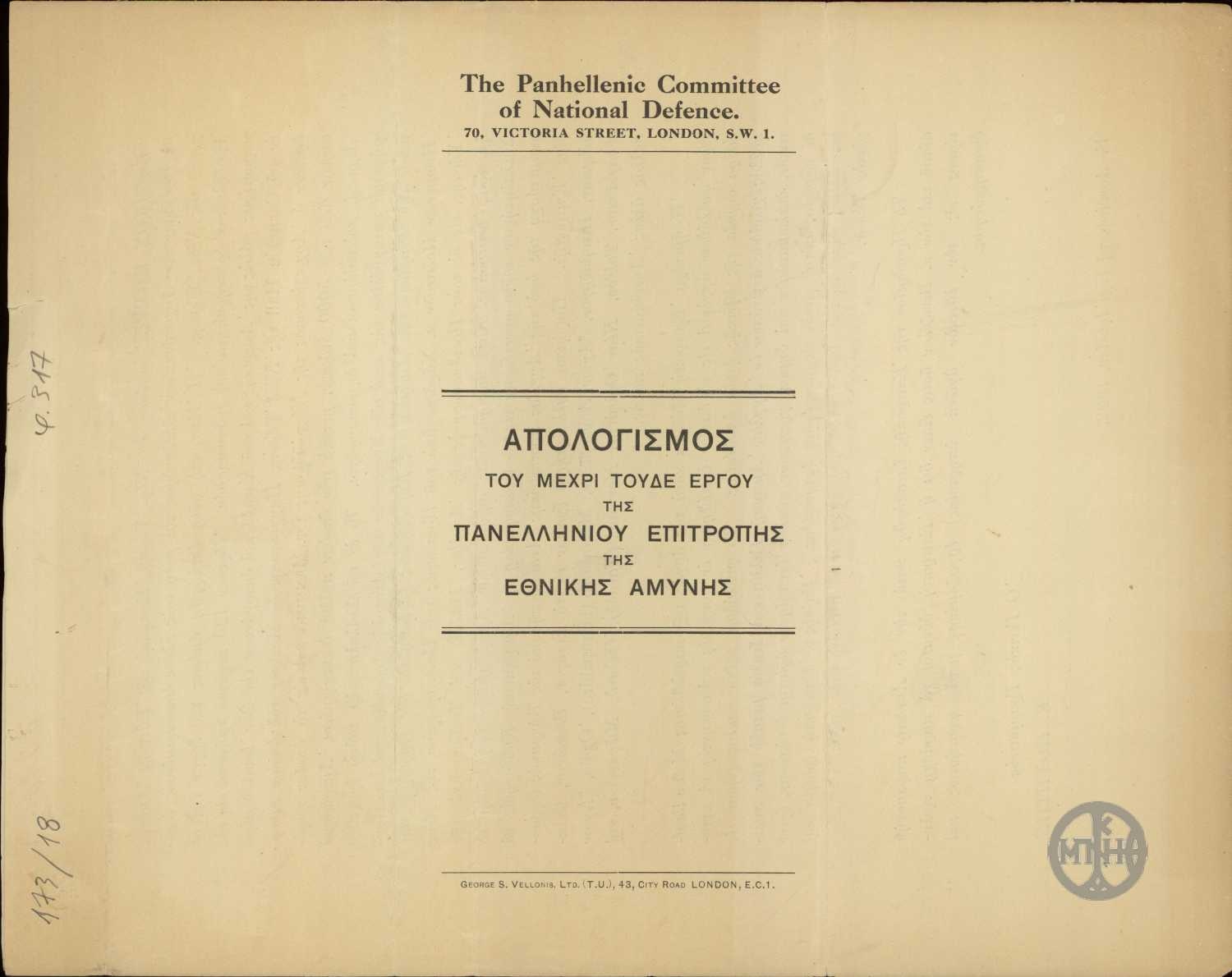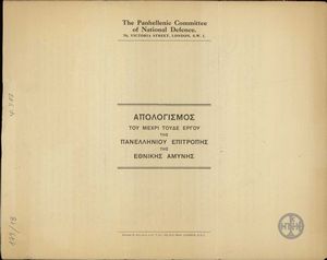 | Κύριος Τίτλος | Απολογισμός του μέχρι τούδε έργου της Πανελληνίου Επιτροπής της Εθνικής Αμύνης. |