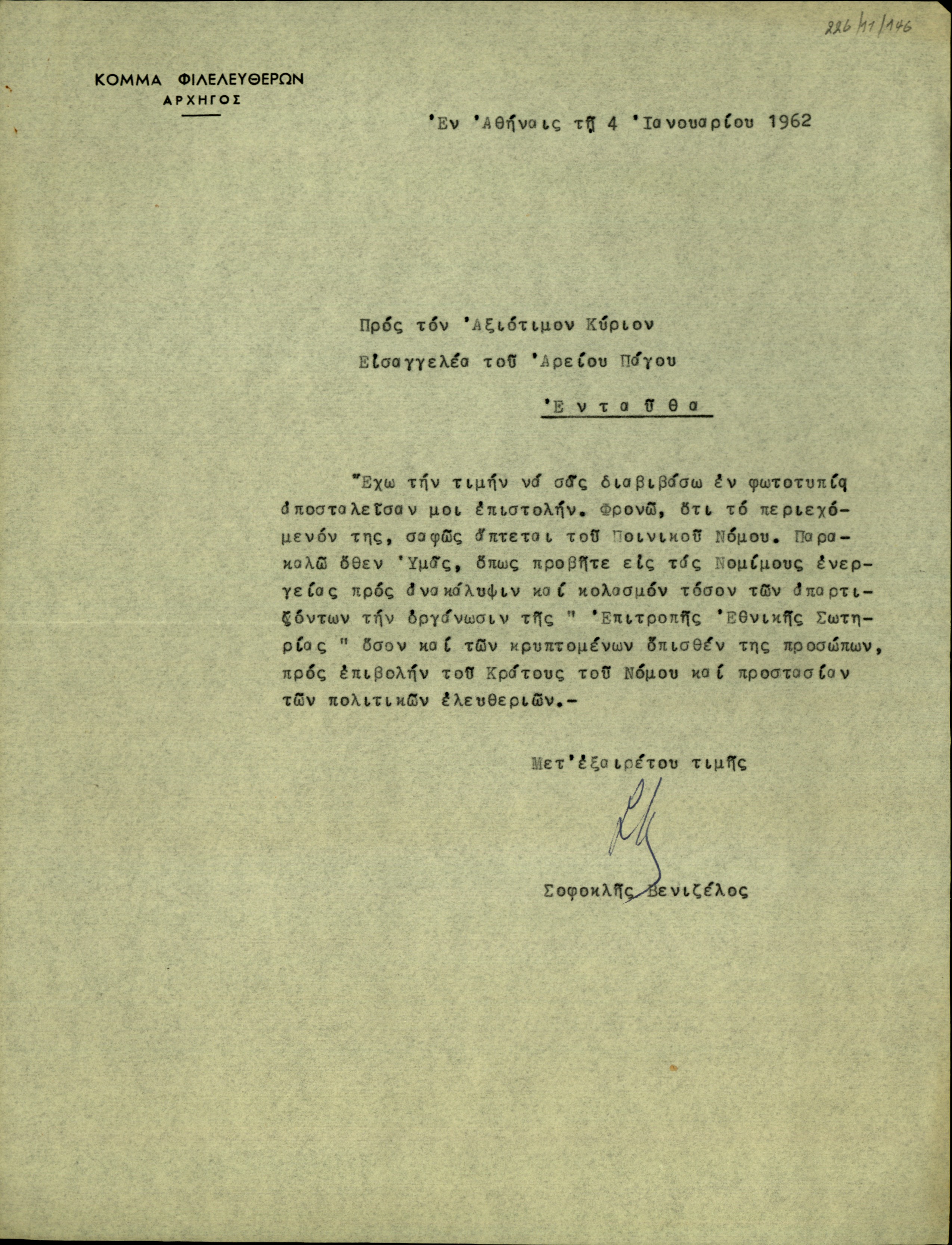 | ΤΙΤΛΟΣ | Επιστολή του Αρχηγού του Κόμματος των Φιλελευθέρων, Γ. Παπανδρέου, προς τον Επίτιμο Αρχηγό του Κόμματος των Φιλελευθέρων, Σ. Βενιζέλο, με την οποία επισυνάπτει την ανακοίνωση της σύσκεψηε των βουλευτών και πρώην υπουργών του Κόμματος των Φιλελευθέρων. |