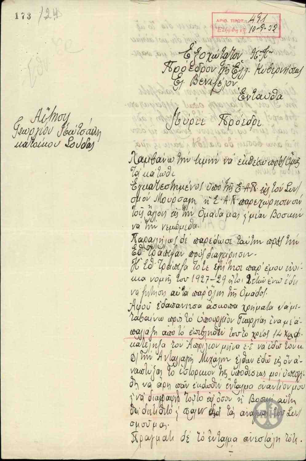 | ΤΙΤΛΟΣ | Αίτηση Τραπεζομεσιτών συναλλάγματος προς τον Ε. Βενιζέλο σχετικά με την παροχή επιδόματος ή χορήγηση δανείου εκ μέρους της Εκδοτικής Τράπεζας. |