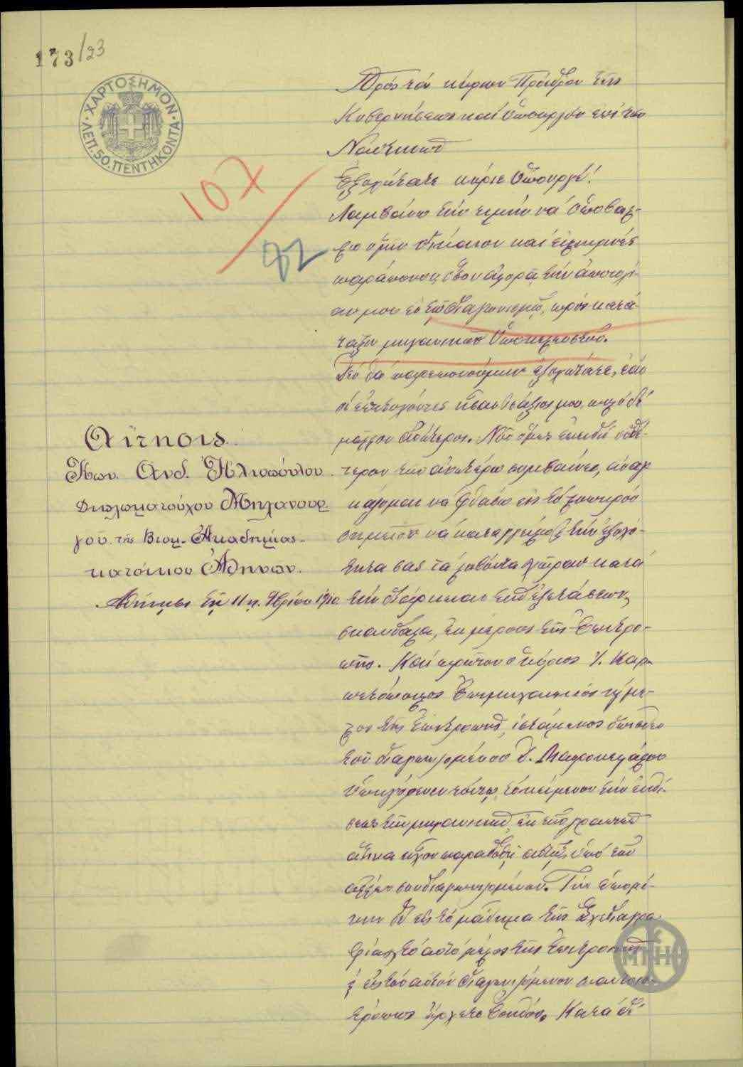 | ΤΙΤΛΟΣ | Αίτηση της Άννας Β. Παπασταύρου προς τον Ε. Βενιζέλο σχετικά με τη διάθεση του μεριδίου της από την κληρονομιά του Δ. Ζητσαίου. |