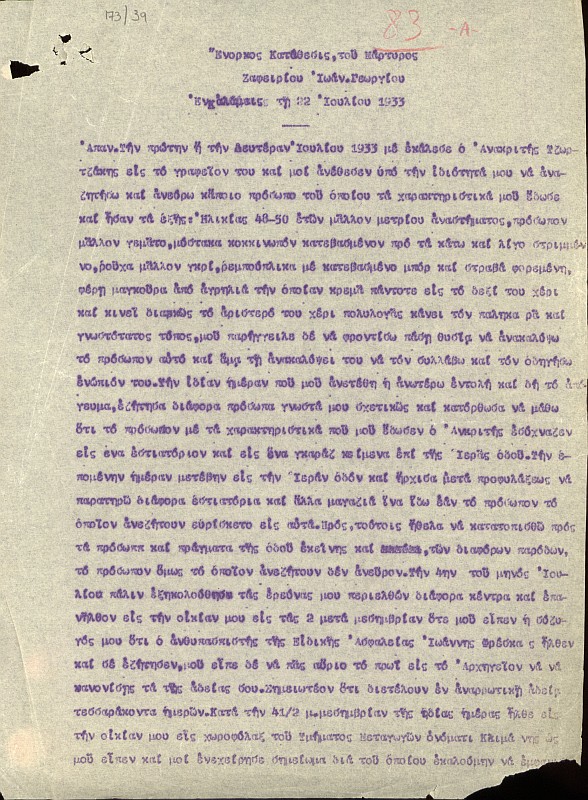 | ΤΙΤΛΟΣ | Ένορκη κατάθεση του μάρτυρα Γεωργίου Ν. Παπαδημητρίου προς τον ανακριτή Α. Ζάννο σχετικά με την δολοφονική απόπειρα εναντίον του Ελ. Βενιζέλου (Ιούνιος 1933). |