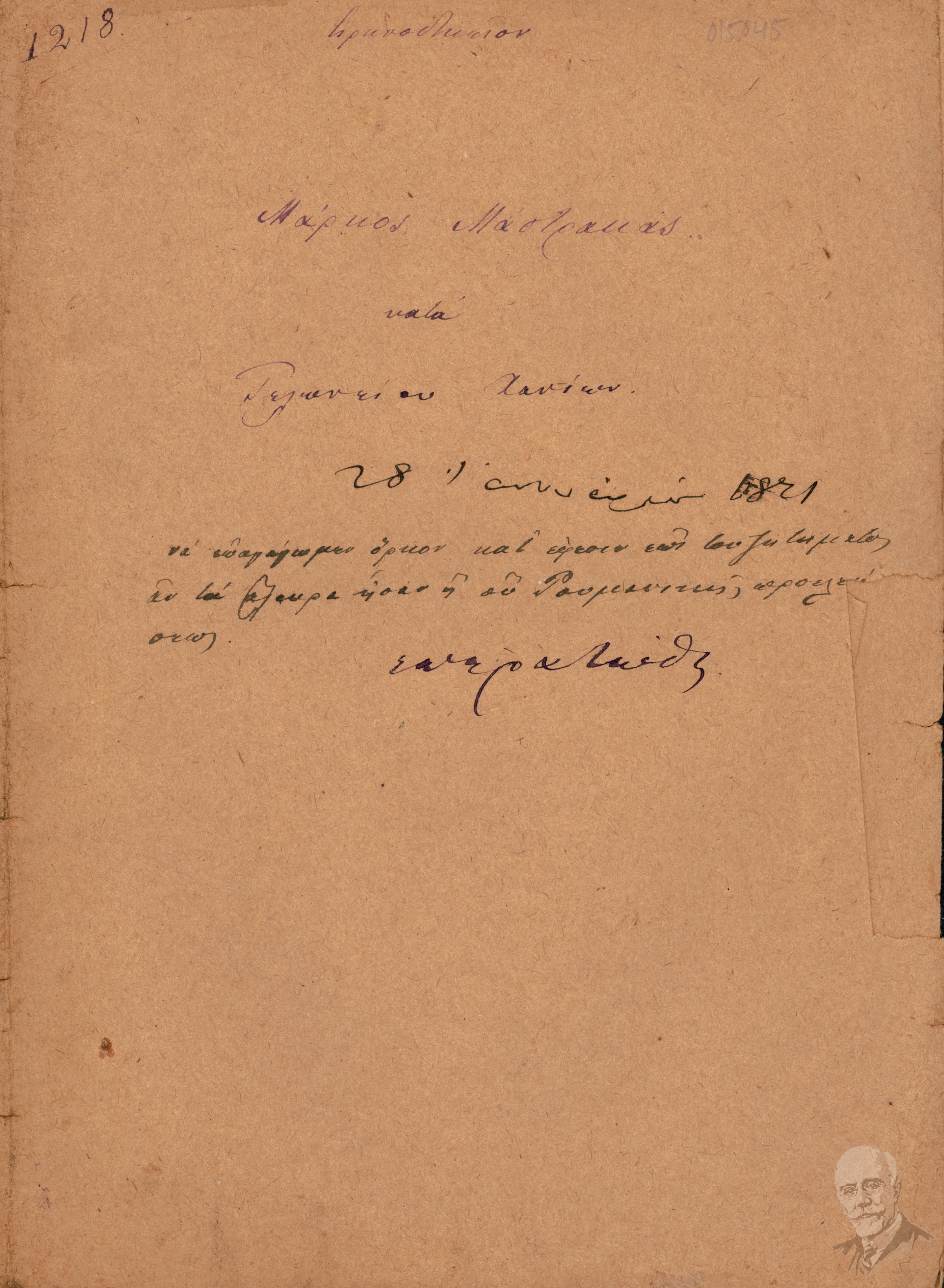 | ΤΙΤΛΟΣ | Φάκελος δικογραφίας με αριθμό 1218, Ειρηνοδικείο, Μάρκος Μαστρακάς κατά Τελωνείου Χανίων |