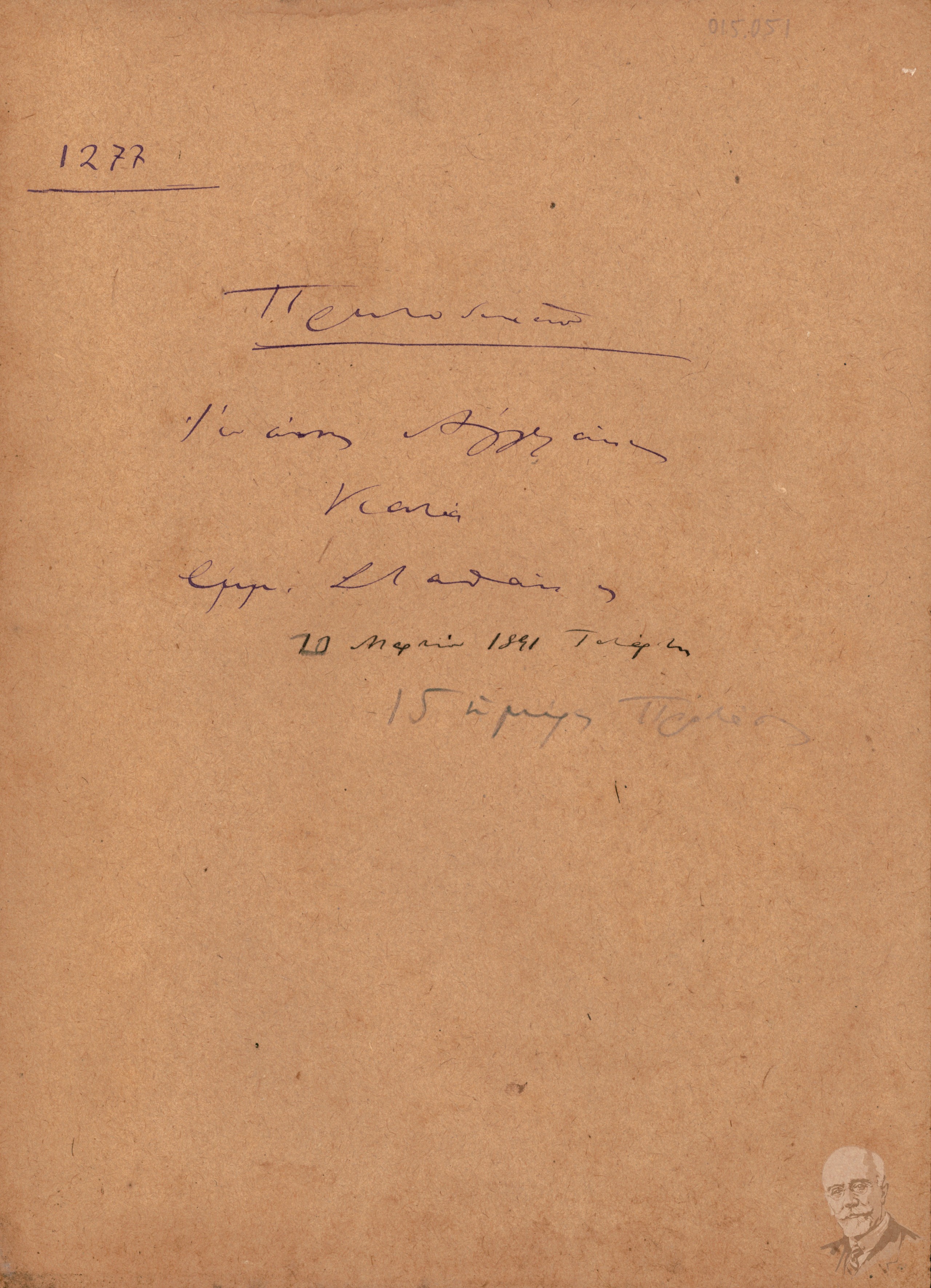 | ΤΙΤΛΟΣ | Φάκελος δικογραφίας με αριθμό 1277, Πρωτοδικείο, Ιωάννης Αγγελάκης κατά Εμμ. Σταθάκη. |