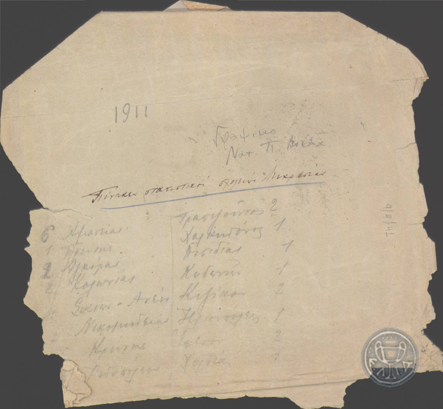 | ΤΙΤΛΟΣ | Σημείωμα φακέλου στον οποίο αναγράφεται "Πίνακες στατιστικοί σχολείων Μικρασίας". |
