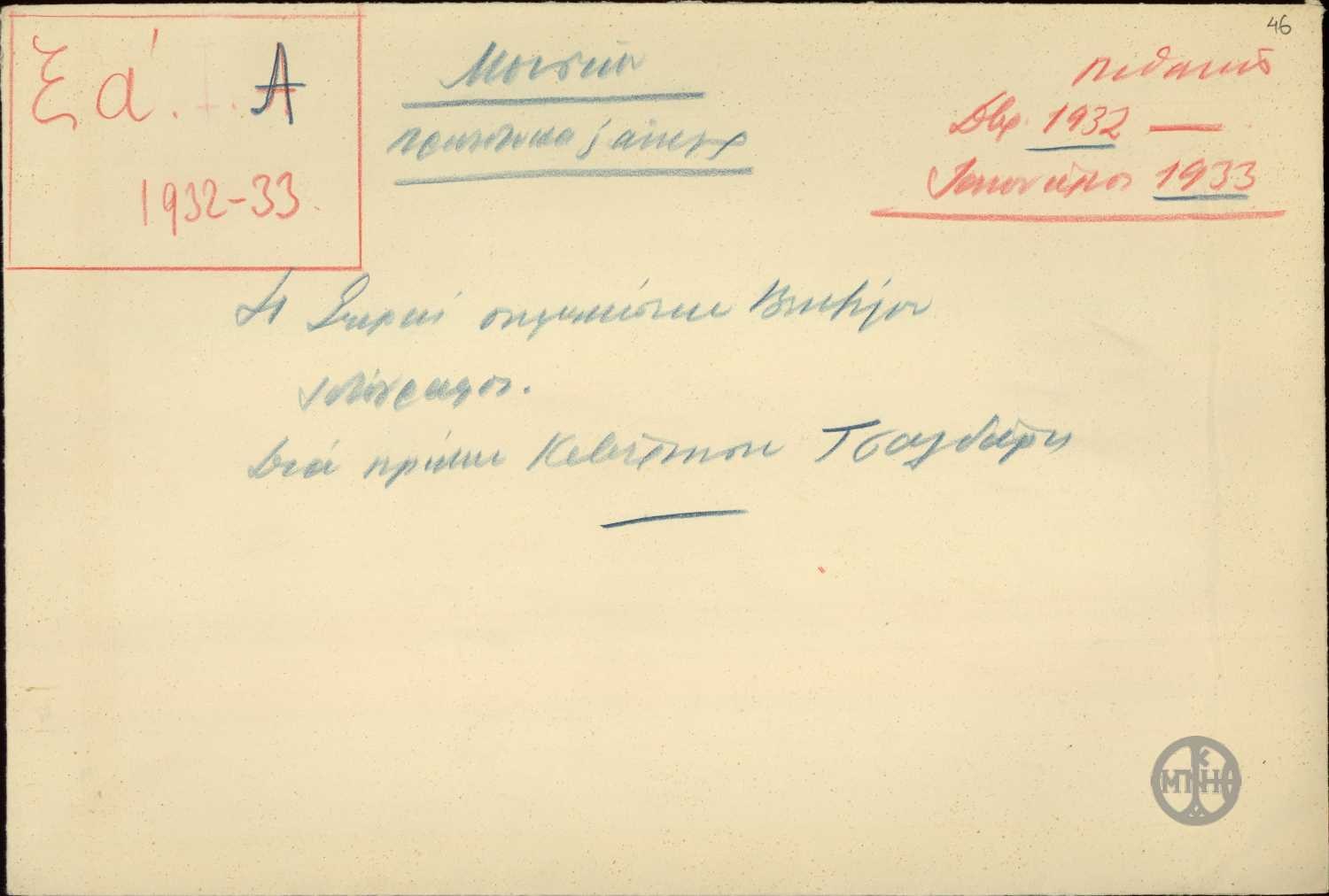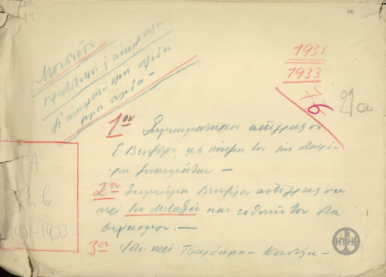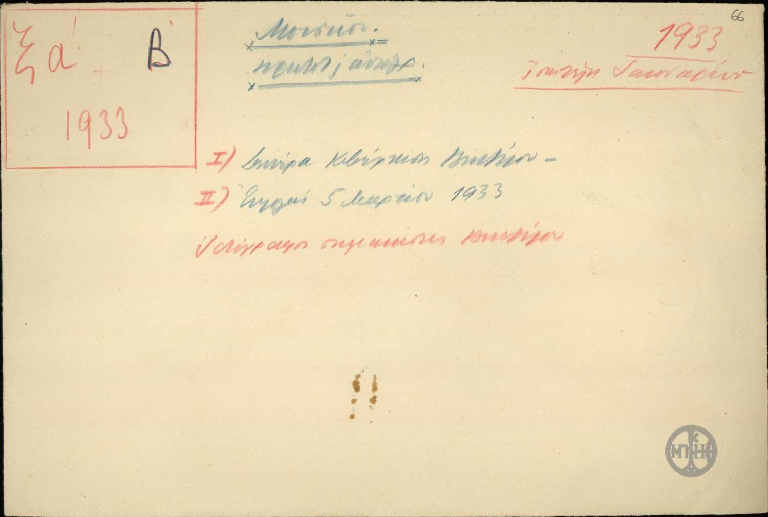 | ΤΙΤΛΟΣ | Φάκελος με την ένδειξη " I) Δευτέρα κυβέρνηση Βενιζέλου. II) Εκλογαί 5 Μαρτίου 1933". |
