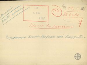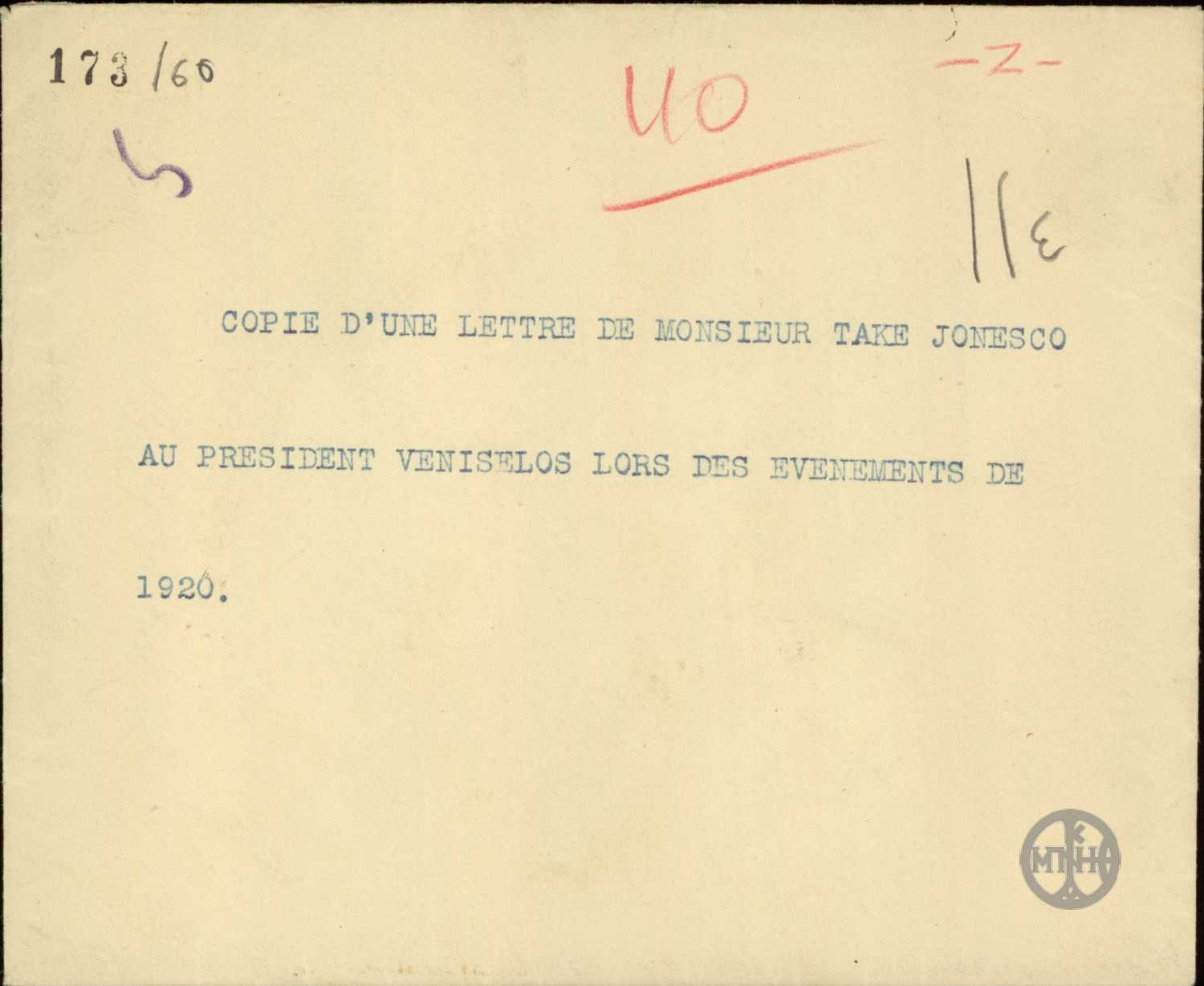 | ΤΙΤΛΟΣ | Φάκελος που αναγράφει ότι περιέχει αντίγραφο επιστολής του T.Ionesco προς τον Ε.Βενιζέλο για τα γεγονότα του 1920. |