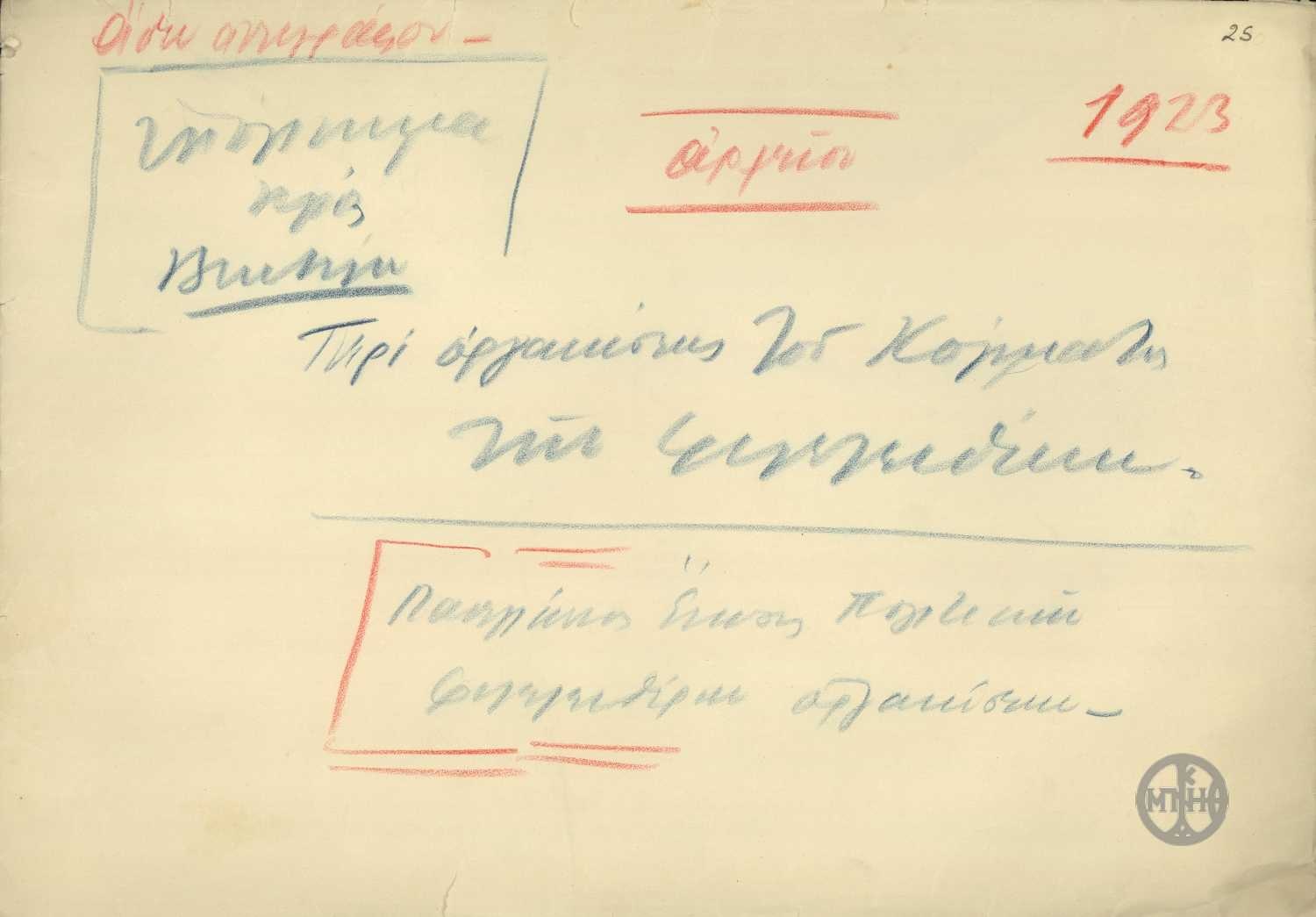 | ΤΙΤΛΟΣ | Σημείωμα φακέλου που αναγράφει: "1923. Περί οργανώσεως του Κόμματος των Φιλελευθέρων". |