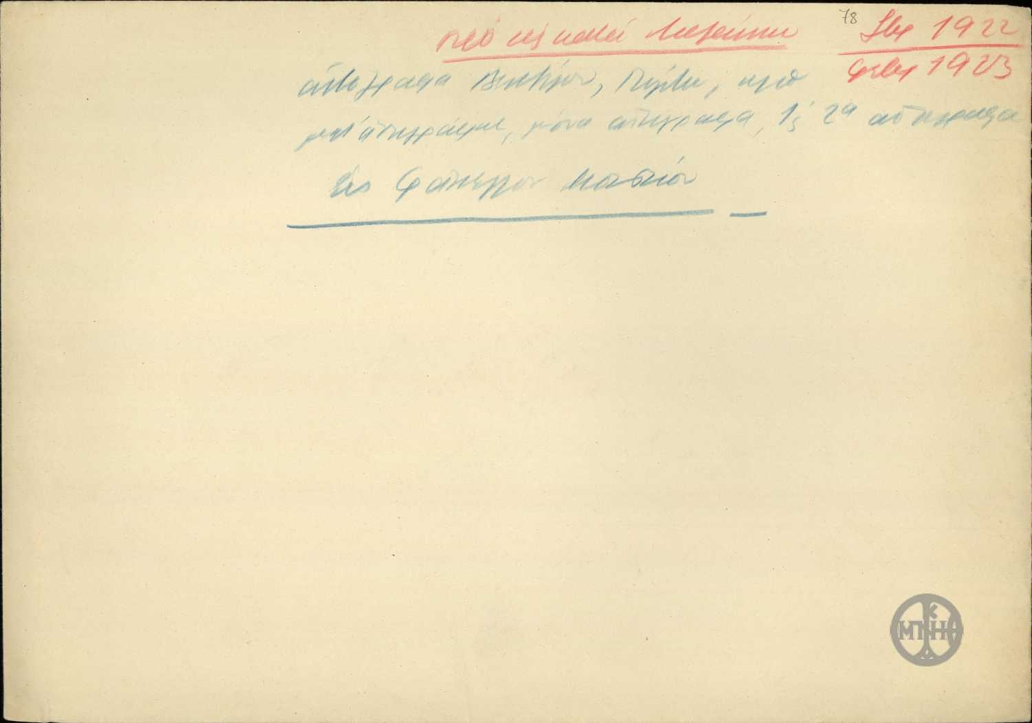 | ΤΙΤΛΟΣ | Σημείωμα φακέλου που αναγράφει:"1922, 1923. Αντίγραφα Βενιζέλου." |