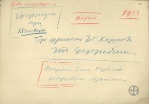 | ΤΙΤΛΟΣ | Σημείωμα φακέλου το οποίο αναφέρει "Κίνημα 1ης Μαρτίου. Τηλεγράφημα βουλευτών Θεσ/νίκης κατά Βασιλικών". |