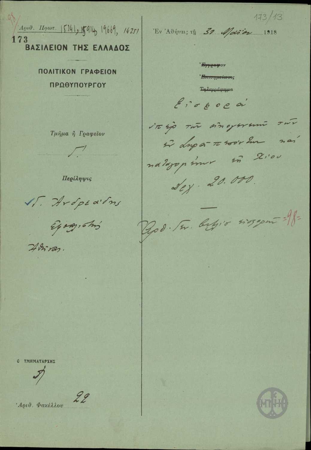 | ΤΙΤΛΟΣ | Φάκελος του Πολιτικού Γραφείου του Πρωθυπουργού με τίτλο "Εισφορά υπέρ των οικογενειών των εν Σκρά πεσόντων και καταγομένων εκ Χίου Δρχ.20000". |