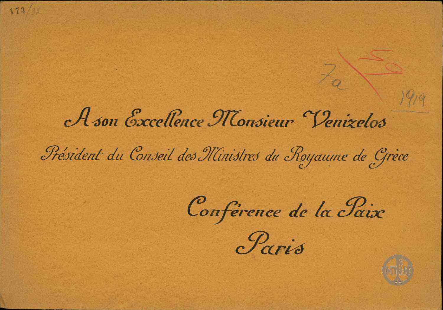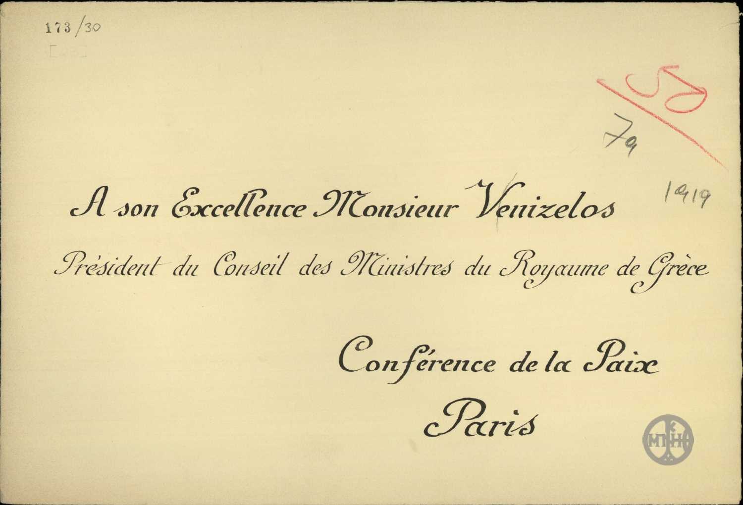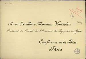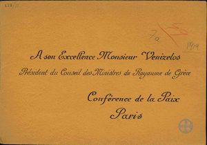 | ΤΙΤΛΟΣ | Φάκελος στον οποίο αναγράφεται "A son Excellence Monsieur Vénizelos Président du Conseil des Ministres du Royaume de Grèce. Conférence de la Paix Paris". |