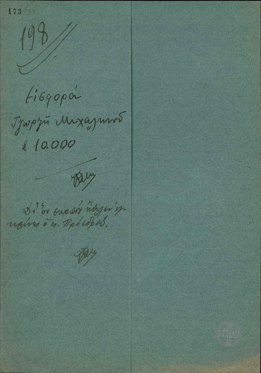 | ΤΙΤΛΟΣ | Φάκελος με τίτλο "Εισφορά Τζώρτζη Μιχαληνού 10000 λίρες. Δι' ον σκοπόν ήθελεν εγκρίνει ο κ.Πρόεδρος". |