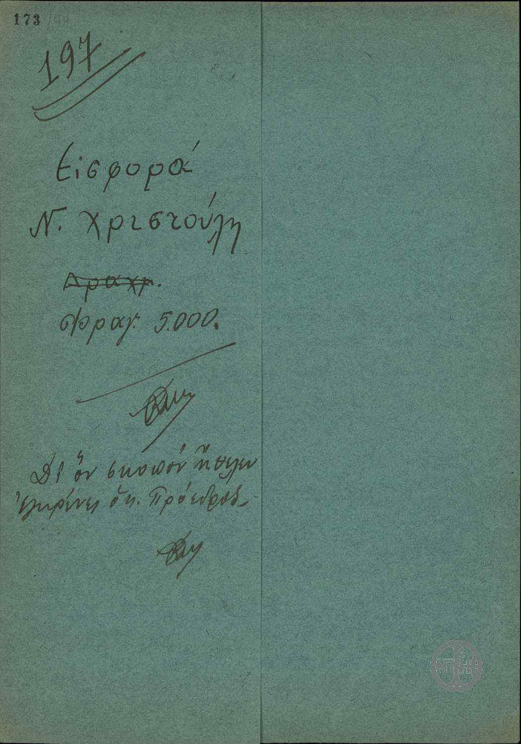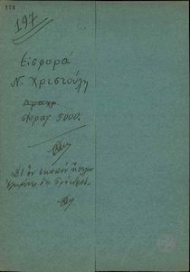 | ΤΙΤΛΟΣ | Φάκελος με τίτλο "Εισφορά του Ν.Χριστούλη φραγ. 5000. Δι' όν σκοπό ήθελεν εγκρίνει ο κ. Πρόεδρος". |