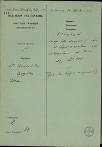 | ΤΙΤΛΟΣ | Φάκελος για τον Ελ. Βενιζέλο ο οποίος περιλαμβάνει υπόμνημα των ιδιωτικών υπαλλήλων της Ελλάδος "περί βελτιώσεως της θέσεως των". |