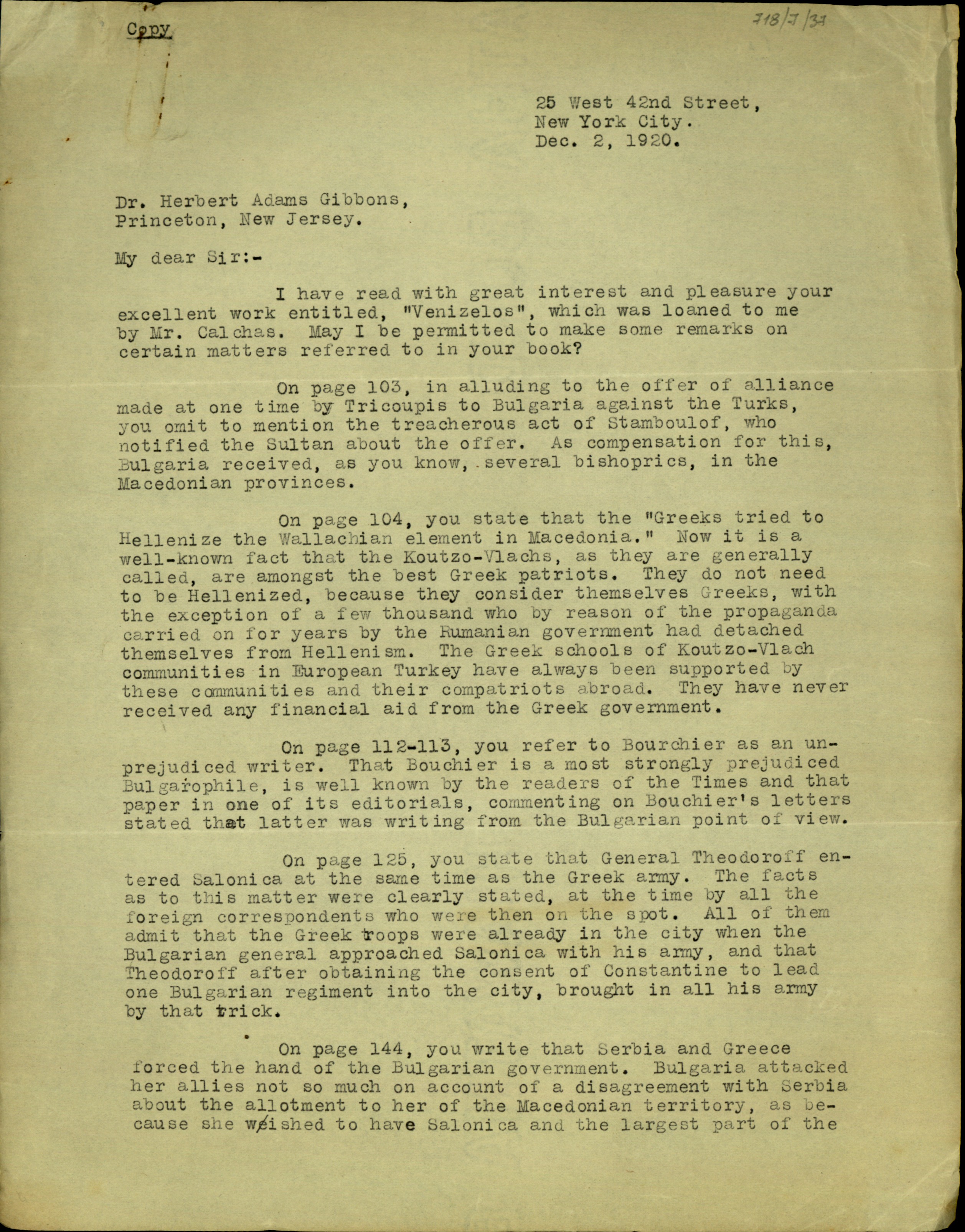 ΤΙΤΛΟΣ Επιστολή του Theodore P. Ion προς τον dr. Herbert Adams Gibbons στην οποία του διατυπώνει τις παρατηρήσεις του σχετικά με το βιβλίο του με τίτλο "Venizelos".